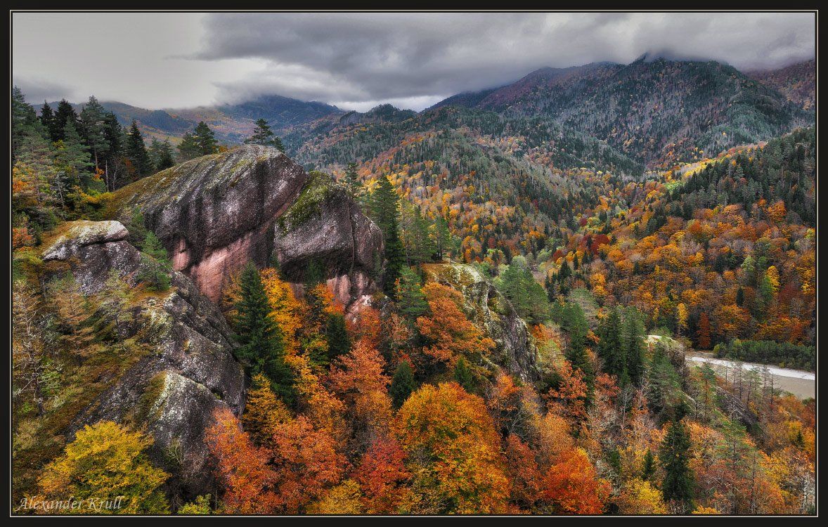 Карачаево-Черкессия. Местечко близ пос. Рожкао в верхнем течении Большой Лабы. Эти места богаты такими вот скальными выходами, достигающими высотой до 100м, по которым интересно полазить и с которых есть что поснимать. Особенно, когда под ногами такая вот осень...