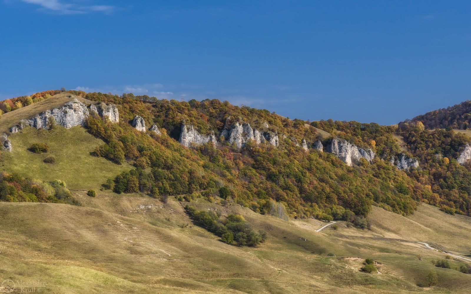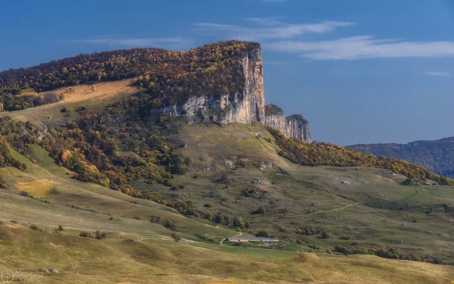 Урупский район Карачаево-Черкессии, октябрь. Ахмет-Гора (1313,7 м) - наивысшая точка длинной семикилометровой куэсты под общим названием Ахмет-Скала, расположенного в западной части Скалистого хребта на административной границе Карачаево-Черкесии с Краснодарским краем. Высота скальных обрывов куэсты местами превышает 200 м. Окрестности горы весьма живописны и фотогеничны, а сама она популярна у скалолазов и BASE-джамперов.