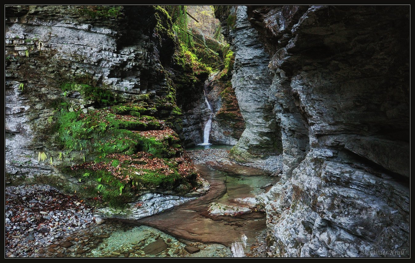Краснодарский край, Туапсинский р-н, один из водопадов ручья Бешеного (Бешенка), притока р. Таштай. Ручей богат каскадами и водопадами в своём узком каньоне, за что и получил такое название.