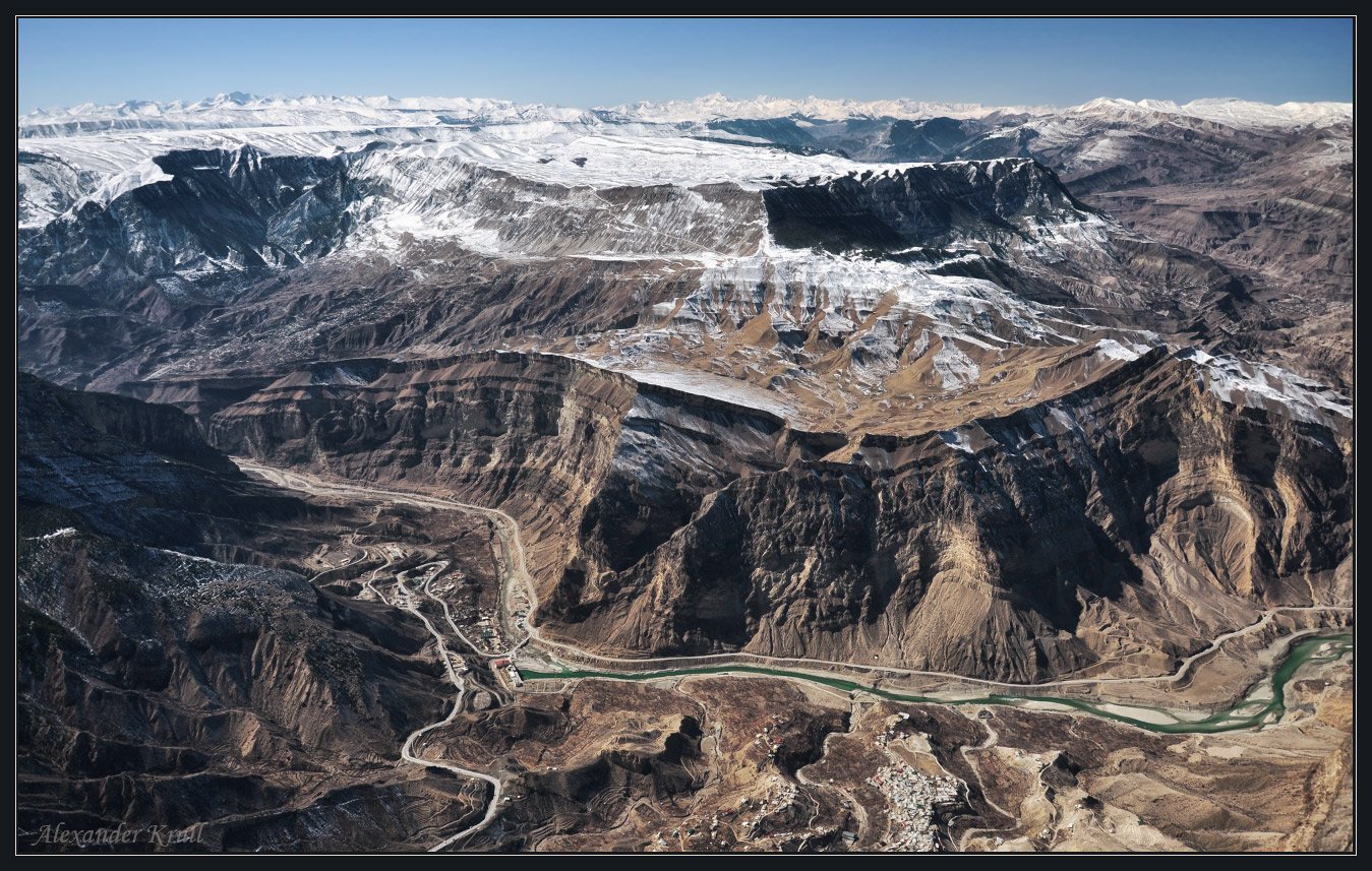 Унцукульский р-н Дагестана. Снимал в начале марта с вертолёта, на высоте ок. 2500м, пролетая над Гимринским хребтом. Видны дорога к Гимринскому тоннелю (уходит за нижний край кадра), р. Аварское Койсу, Ирганайская ГЭС и в нижней части кадра - пос. Гимры - родовое село двух легендарных имамов Дагестана - Газимагомеда и Шамиля.