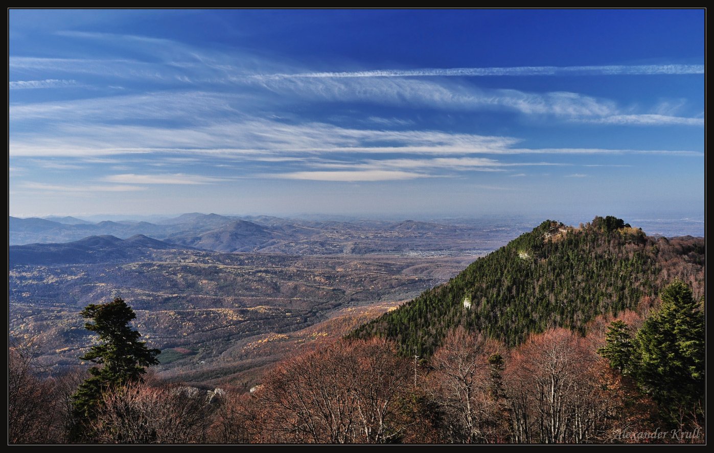 Вид с северного окончания Лагонакского хребта на северо-запад мимо г. Разрытой. Слева, в низине, русло р. Цыца, которая всего километром выше протекает по глубоченному ущелью, а здесь уже вырвалась на просторы.