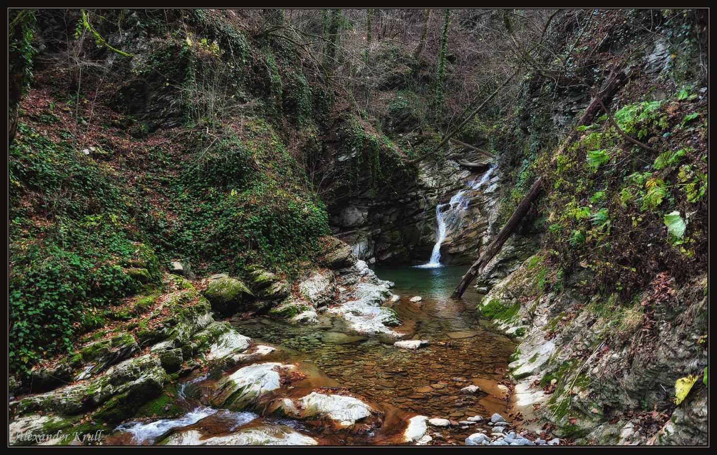 Туапсинский район Краснодарского края, приток р. Таштай - ручей Бешеный, получивший своё название за многочисленные каскады и водопады с глубокими изумрудными ваннами.