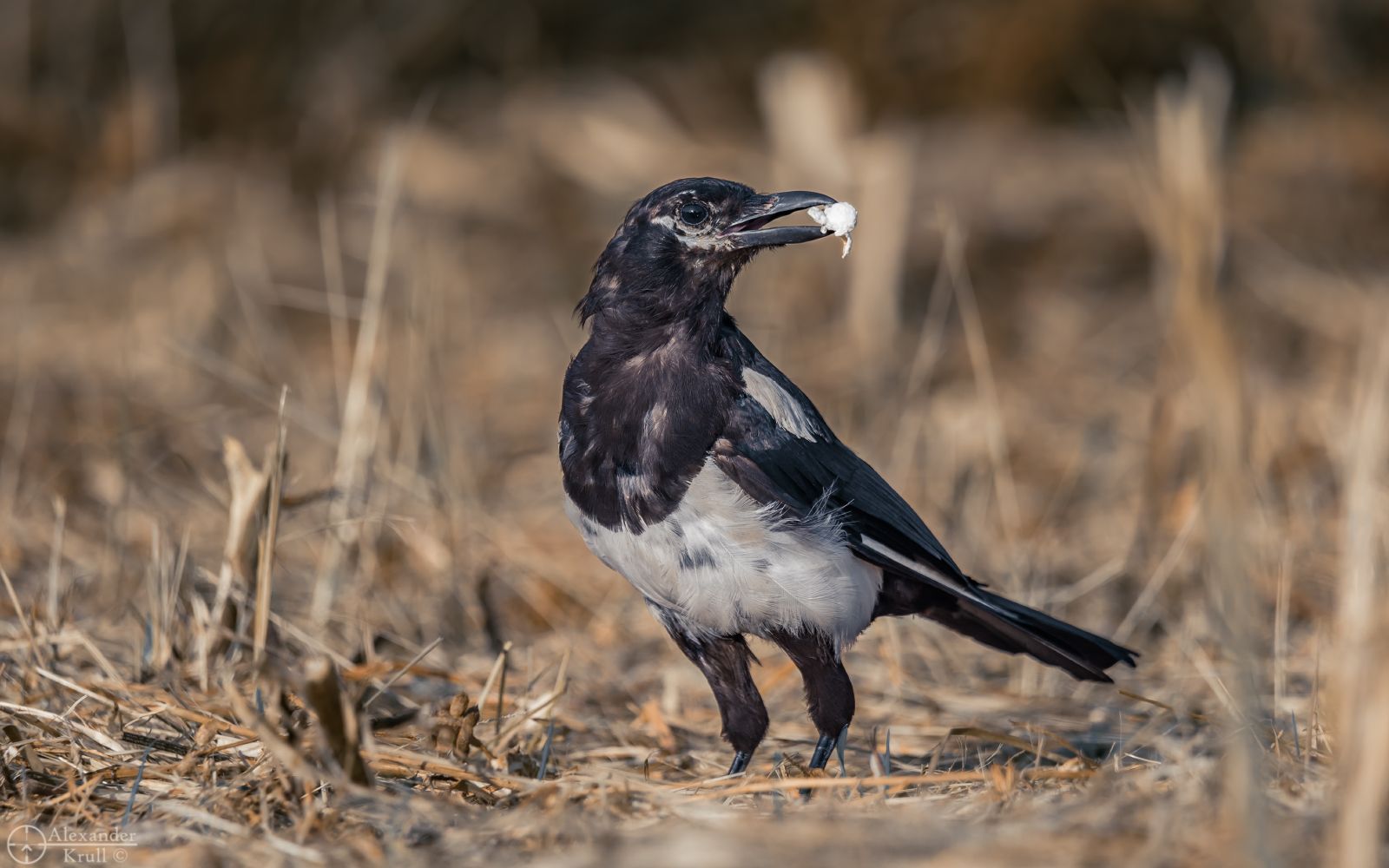 Чем же можно подманить к скрадку столь осторожную птицу, как сорока, пусть даже она совсем молодая, как на этом фото? Мне удалось подобрать ключик к соблазнению на фотосессию голодных с утра пораньше белобок - завтрак в виде рассыпанного в стерне попкорна! Очень любопытные по своей природе, они не могли не заинтересоваться маленькими контрастными белыми объектами на земле. Но когда оказалось, что эти интересные предметы еще и съедобны и вкусны, то осторожность притупилась, а внимание к странному сооружению - моему скрадку - стало не столь пристальным.