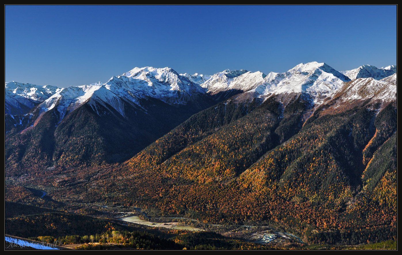 Карачаево-Черкессия, октябрь. Верховья Большой Лабы и пограничная застава в маленьком посёлке Загедан. Вид с г. Чистоган.