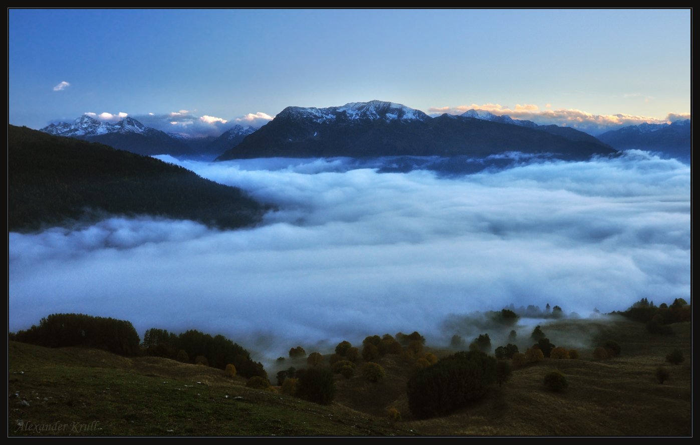Карачаево-Черкессия, вечер, 18.43. Вид на долину Большой Лабы с подъёма на хребет Абишира-Ахуба. Всё начиналось с лёгкой вечерней дымки, которая по мере наступления сумерек всё уплотнялась до состояния туманного моря...