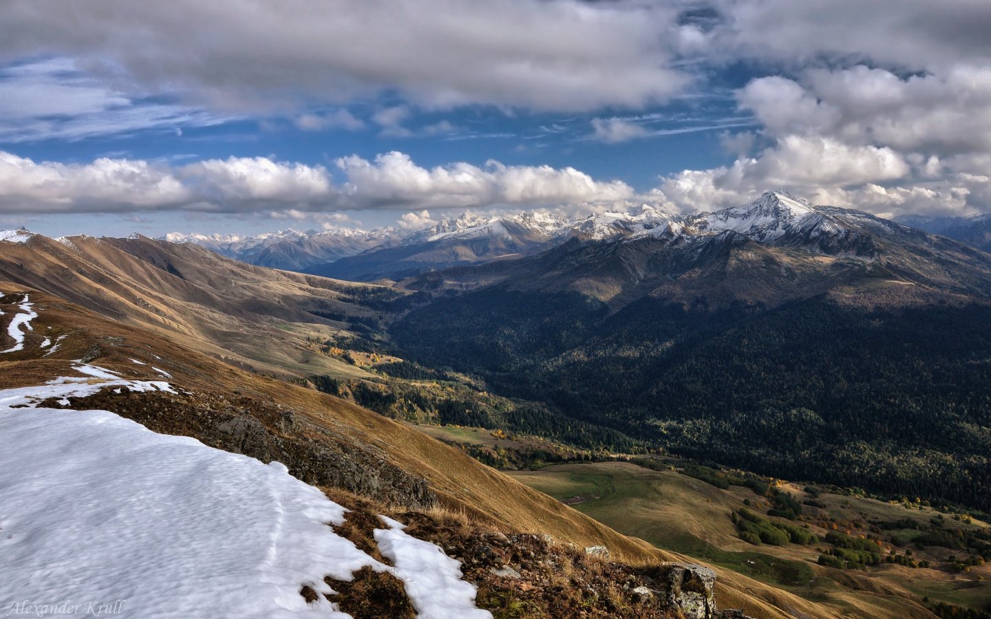 Карачаево-Черкессия. Стою на хребте Абишира-Ахуба (2700м.), любуюсь видом на г. Закзан-Сырт (3097м.) и вечернюю подсветку долины р. Пхия. Вдалеке - некатегорийный перевал Пхия, через который пути ведут в Архыз.