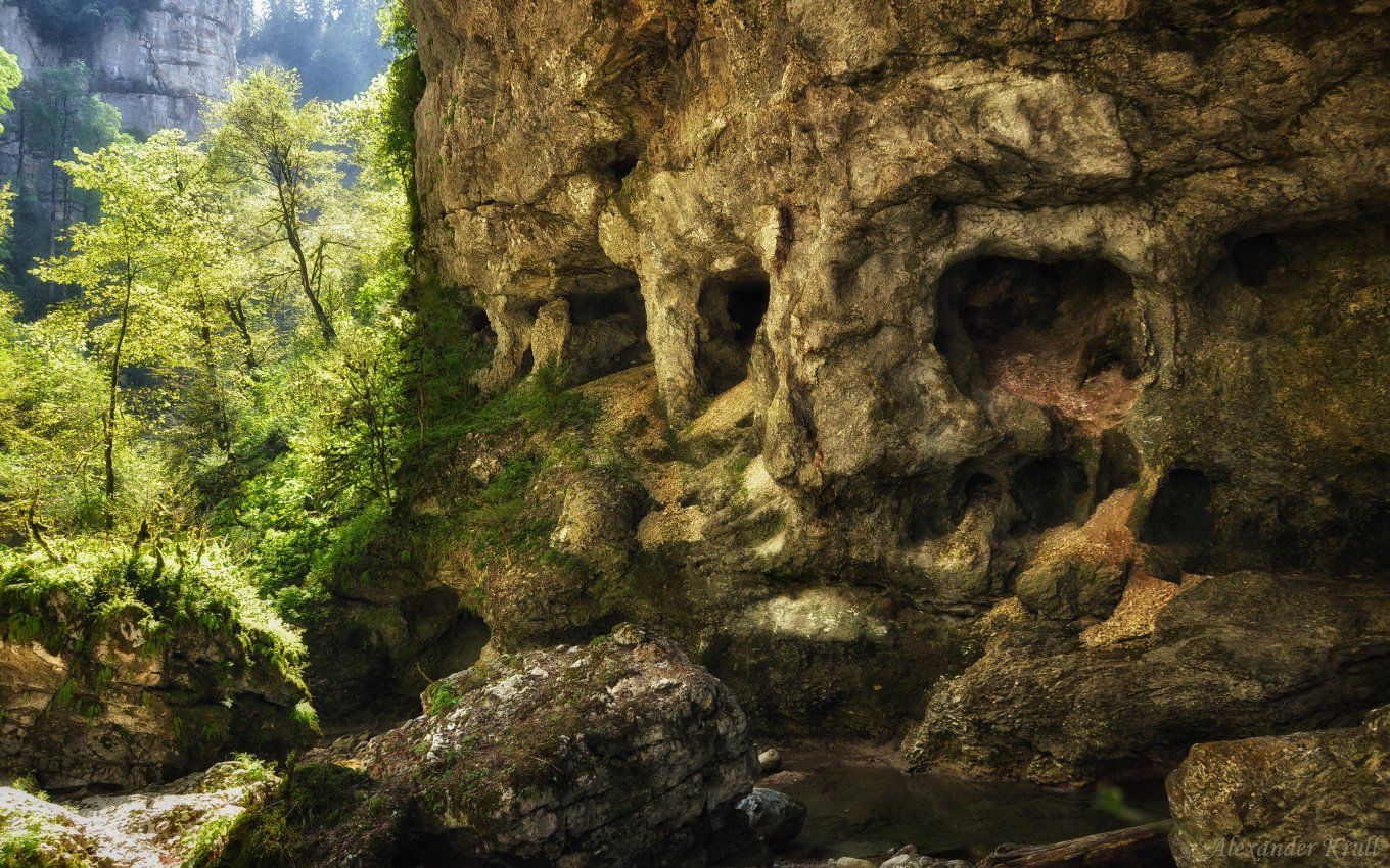 Апшеронский район Краснодарского края, каньон ручья Сухая балка, притока р. Курджипс. На дне каньона, в этом глубоком коридоре среди вертикальных стометровых скалистых стен чувствуешь себя муравьём. А этот серьёзный лик, наблюдающий за забредшими сюда туристами из тени испещрённой гротами колоссальной ниши, как бы напоминает о том, что нам, букашкам, с уважением нужно относиться к этим местам, не загаживать их своим мусором и быть осторожным на скользких скалах каньона.