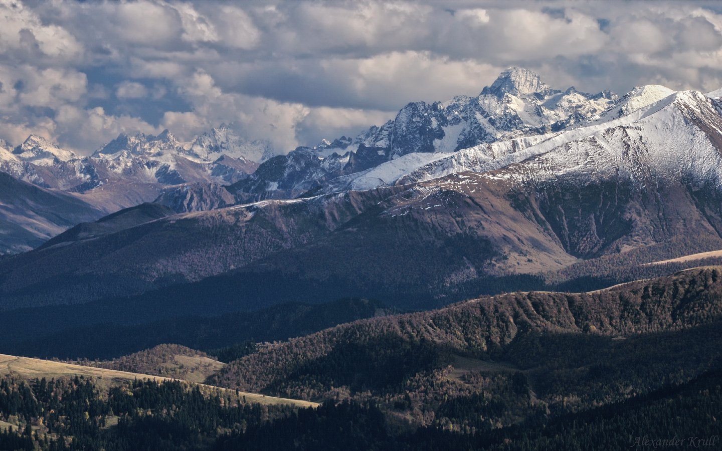 Карачаево-Черкессия. Вид с хр. Абишира-Ахуба на вершину София (3637м.). Левее в облаках прячутся вершины Домбая. В нижней части кадра р-н пер. Пхия (2161м. н/к)