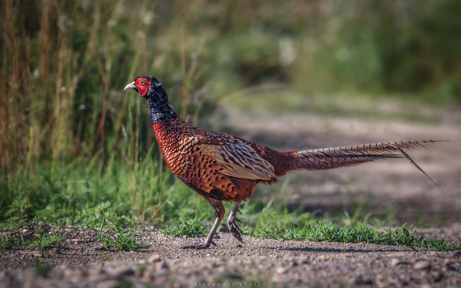 Рано утром этот фазан вышел на дорогу перед моим скрадком, где я ожидал появления зайцев, и неспеша прогуливался взад-вперед. Судя по несколько потрепанному виду он недавно побывал в какой-то передряге, а по вальяжной поступи и гордому виду можно было предположить, что из нее он вышел победителем.