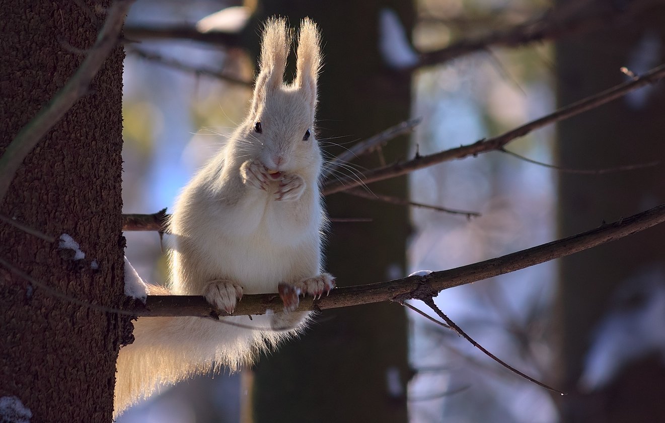 В лесу в Ясной Поляне живет эта необычная белка. Скорее всего, это мутация наподобие альбинизма, но белка не альбинос - не полностью белая и глаза не красные.