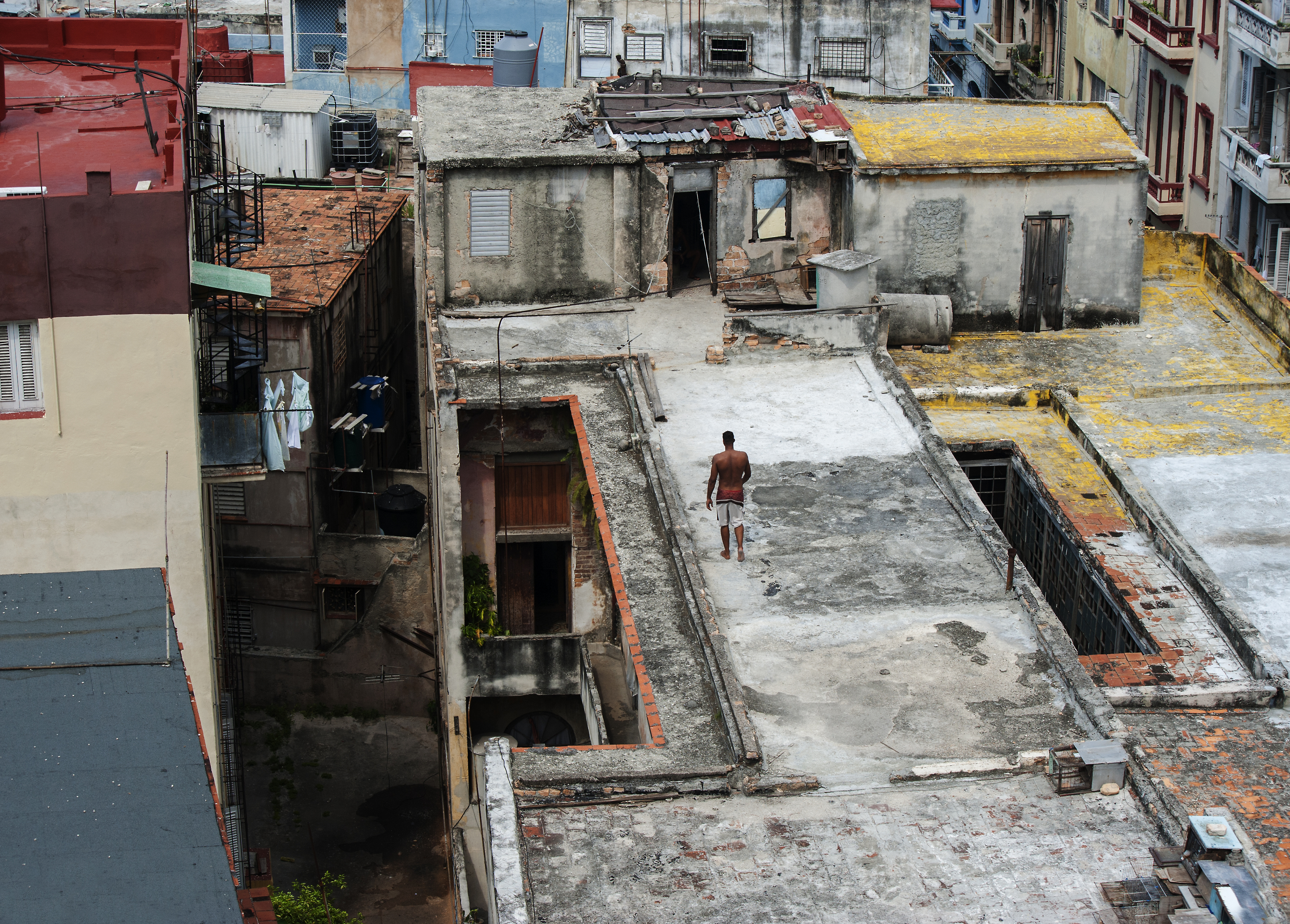 Good framing of the rooftop scene in Havana—composition is strong, with natural light and real texture. The figure adds scale and life; could benefit from slightly more contrast to sharpen details in the shadows.