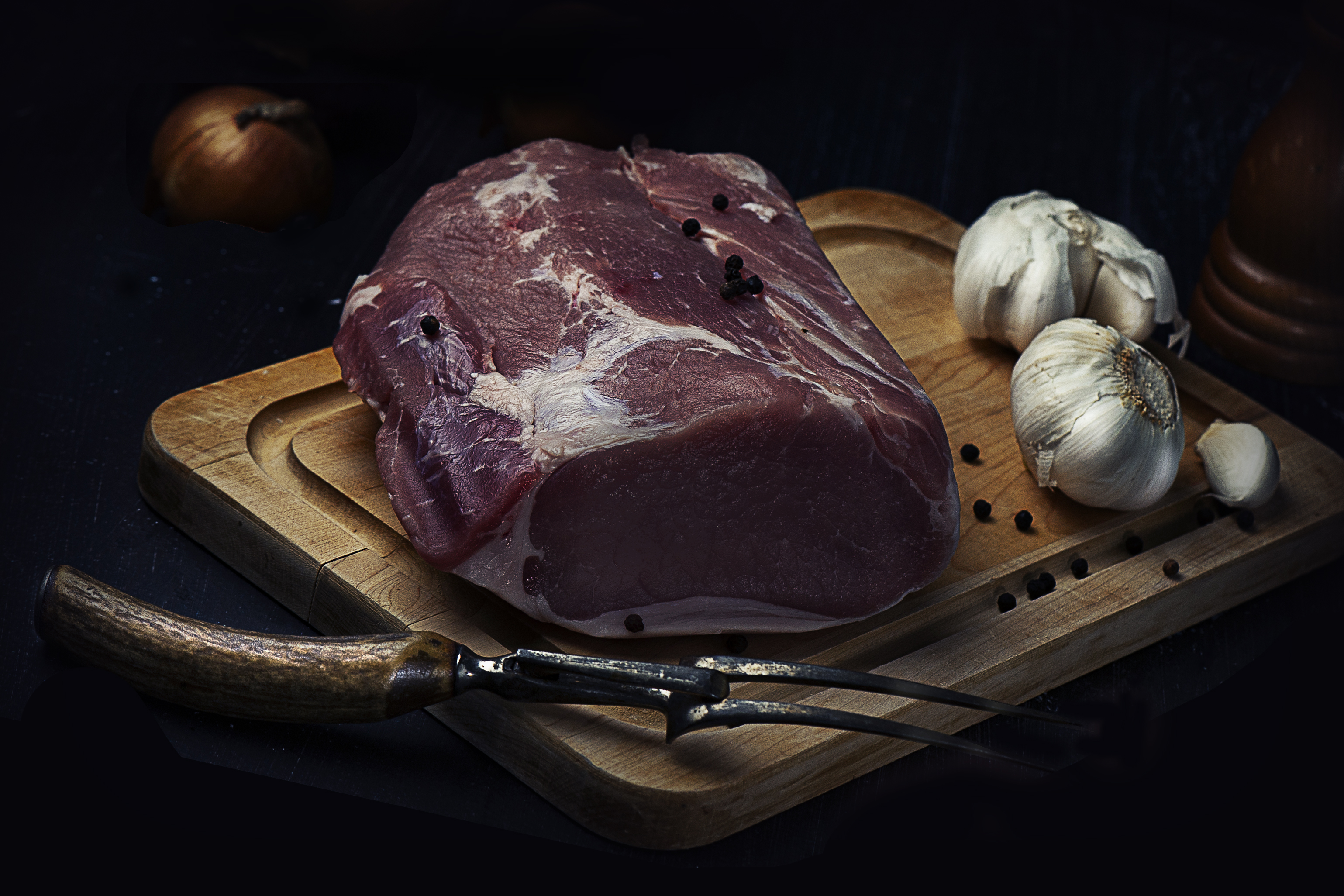 Solid still life. The meat has good texture, the lighting is moody but clear, and the composition is balanced — garlic, pepper, fork, all in place. Wooden board adds warmth without being overdone. Slight shadow play gives depth. Clean, straightforward, and well-considered. 👍