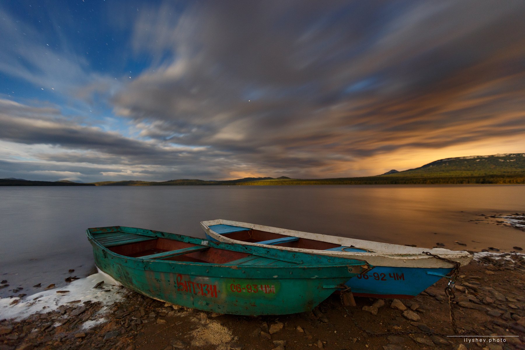 закат, лодки, озеро, Зюраткуль, пейзаж, ночная съемка, берег озера, облака, Dmitry Ilyshev