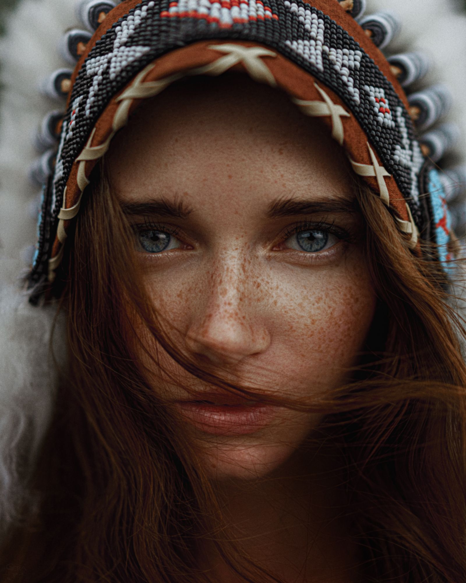 Фотография передаёт мгновение — взгляд модели, устремлённый прямо в камеру, словно проникает сквозь объектив. Тёплые оттенки шапки контрастируют с холодным светом, подчёркивая текстуру кожи и волос. Ветер, захвативший пряди, придаёт снимку динамику и естественность. Работа Георгия Чернядьева — это слияние портретной выразительности и этнического стиля, застывшее в кадре.