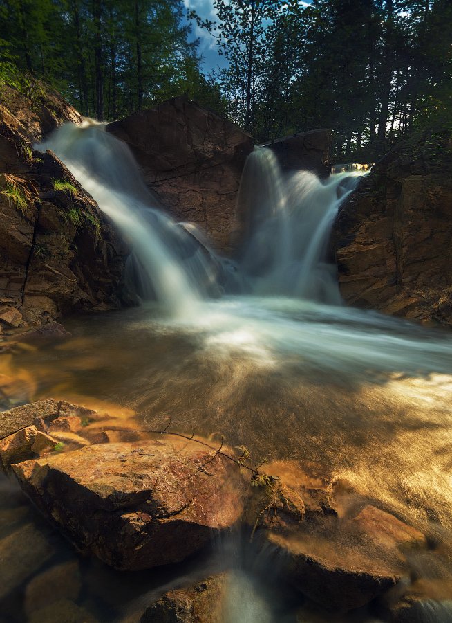 Водопад на реке Букачача, Забайкальский край, Чернышевский район, п.Букачача. Вот, что удивительно, всю жизнь я прожил в этих местах, но никогда не был на этом водопаде. Если честно я даже не слышал о нем. Помню как в прошлом году мне рассказали об этом месте в первые и показали фотографию. На фото он выглядел совсем невзрачно. Казалось водопад всего метр или полтора в высоту. Но было очень интересно увидеть его в живую. И вот спустя год, в очередной раз приехав в Забайкалье, мне удалось посетить это замечательно место. И что же оказалось? В реальности его высота была девять или десять метров, в место ожидаемого одного метра. Потоки воды падали с большой силой огибая причудливую скальную породу. А шум воды был слышен еще на подъезде к нему. Радости моей не было предела, уж очень я люблю подобные места. Изрядно набегавшись с камерой вокруг, мне пришла дикая идея искупаться прямо под водопадом. Ну что же, сказано сделано. И я быстро разделся и полез под бурный поток, тот что слева. Ощущения такие, как будто на тебя бросают ледяные мешки с песком. Удерживаясь руками за скалу я провисел так несколько секунд. После чего был небольшой заплыв в самом глубоком месте под водопадом. Глубина была около метра, может чуть меньше, но мне хватило, что бы пару раз окунуться и выпрыгнуть от туда с криками, дрожа от холода. Теперь в памяти остались приятные воспоминания и желание приехать туда снова и провести там побольше времени. И спасибо учительнице местной школы, что показала нам это место.