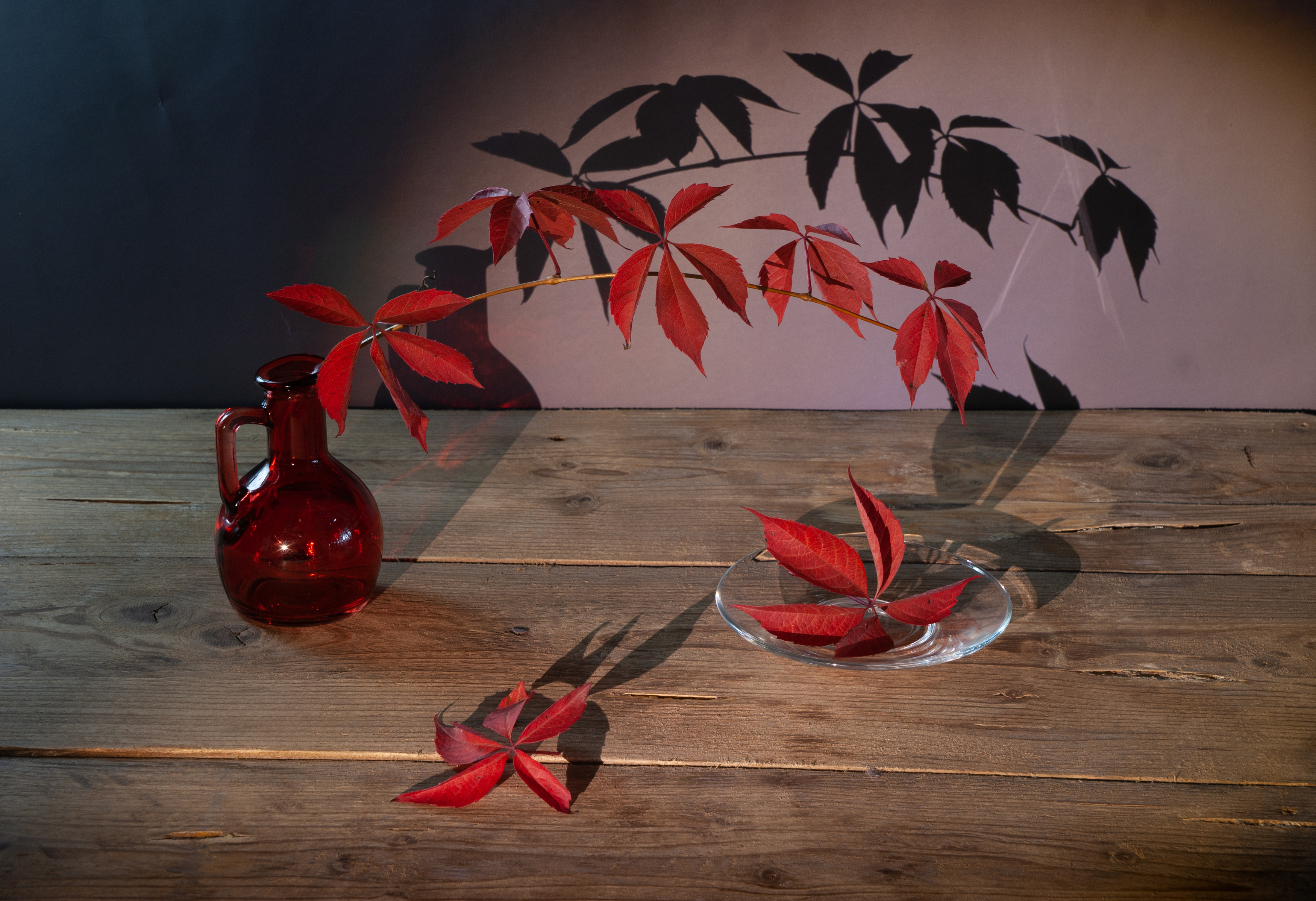 Серия передаёт тёплую атмосферу осени: красные листья, деревянный стол и бутылка создают уютный, почти сказочный кадр. Цветовая гамма и освещение варьируются между кадрами — в третьем изображении фон более насыщенный, что добавляет драматизма, хотя общая композиция остаётся стабильной.
