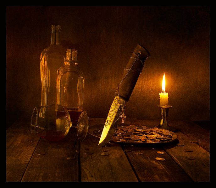 свеча, вино, кинжал, монеты, крест, огонь, натюрморт, Ирина