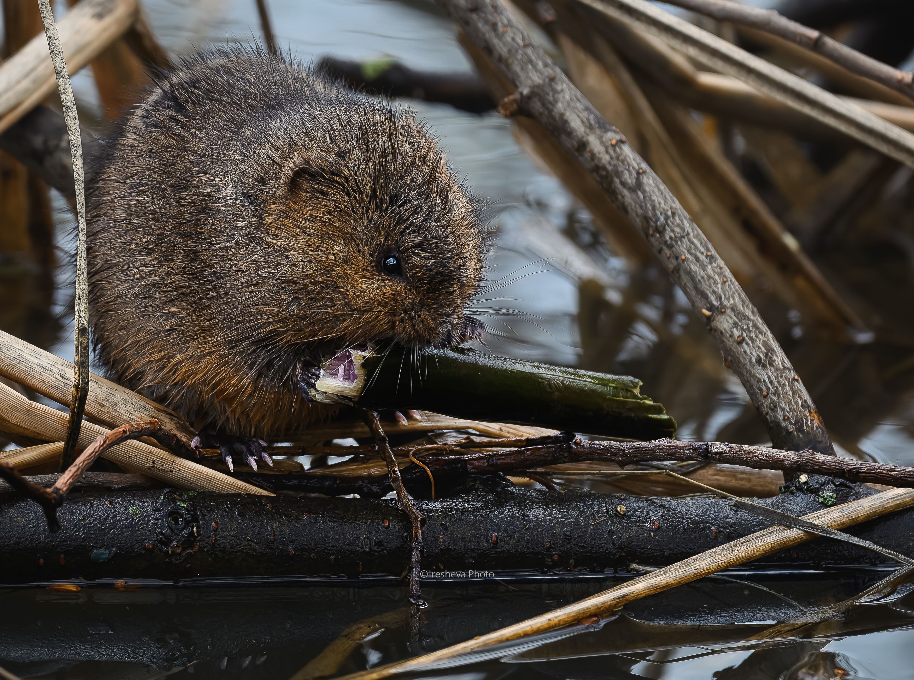 На снимке запечатлена водяная полёвка — небольшой полуводный грызун, обитающий вблизи водоёмов. Животное с густой коричневой шерстью и заметными резцами перекусывает зелёный стебель растения, вероятно, тростника или рогоза. Сцена передаёт типичное поведение животного в дикой природе: кормление на берегу среди растительности. Фотография выполнена крупным планом, что позволяет рассмотреть детали внешности зверька и его активность.