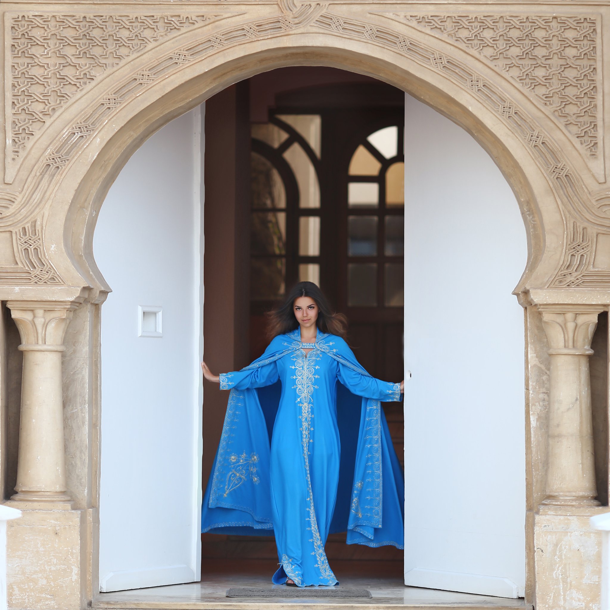Тунис, Монастир, восток, восточные сказки, Oriental tales, восточная девушка, восточный голубой костюм, голубое платье, восточное платье, белые двери, открывает двери, архитектура, восточная архитектура, Ирина Голубятникова
