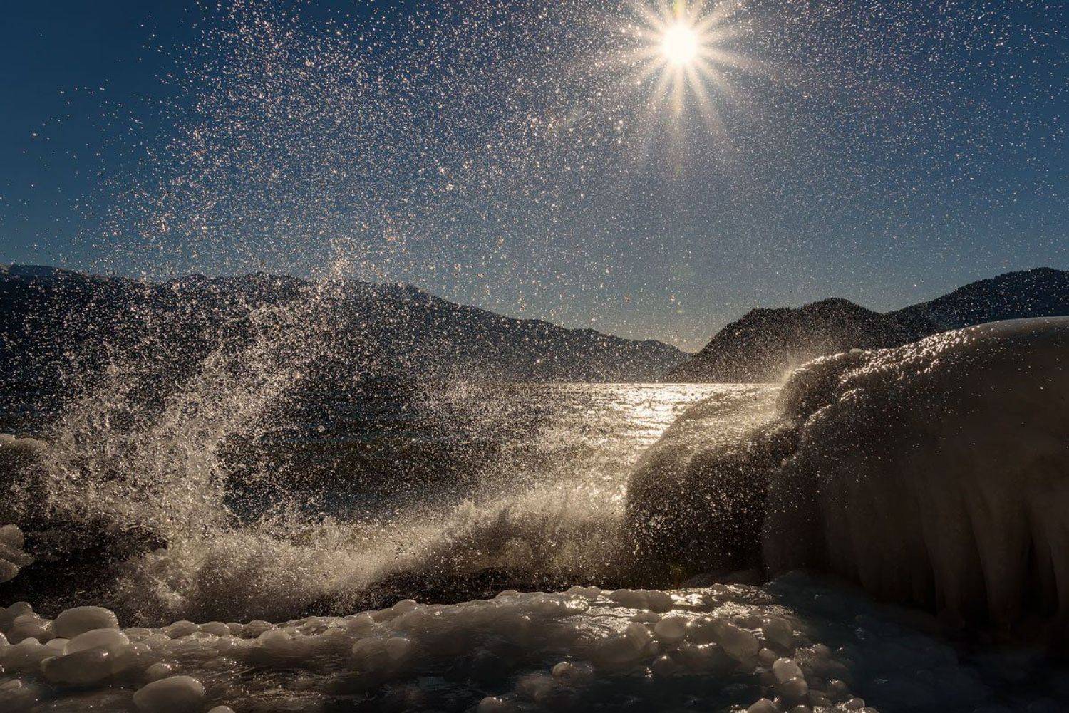 Солнце и горы сквозь брызги волн в солнечный зимний день. Телецкое озеро. Яйлю. Алтай.