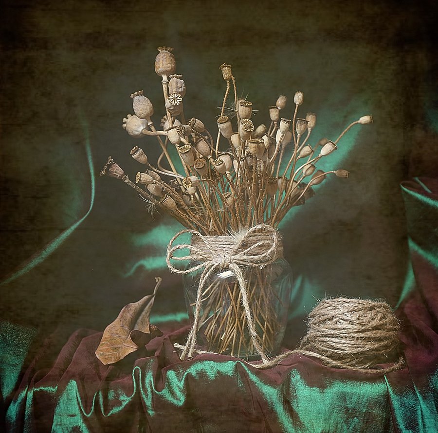 martwa natura, jesień, makówki, sznurek, liść , zieleń ,fotomalowanie,, Ela Drzazga