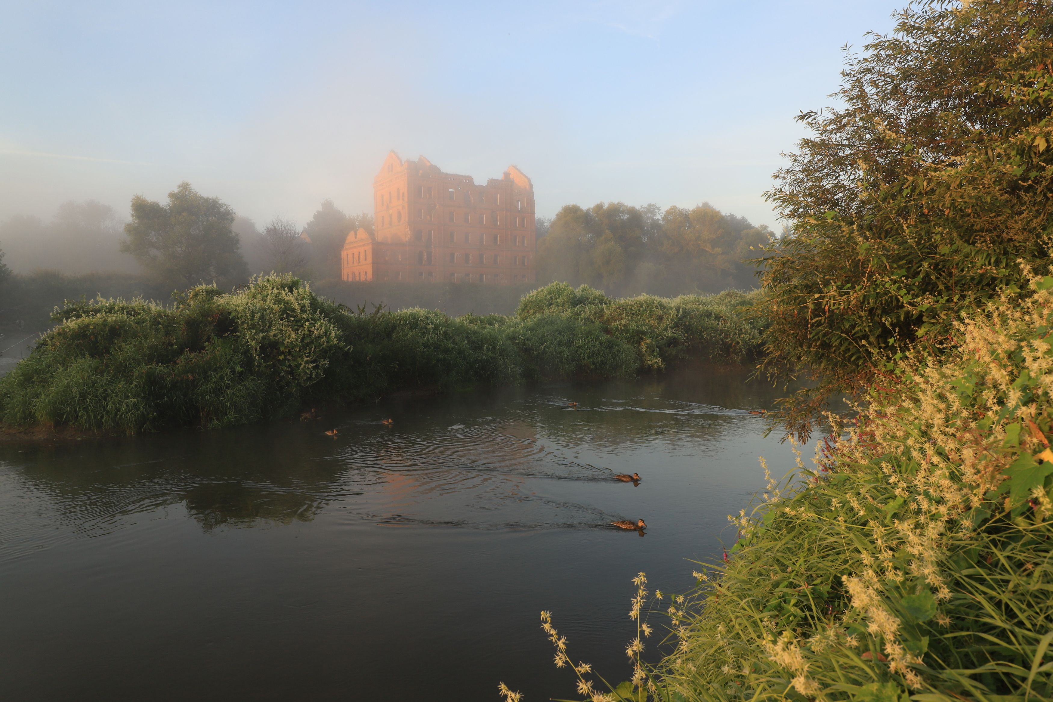 мельница руины утка утро река протва московская область регион калужская туман нежный свет рассвет утренний спокойствие плыть течение вода отражение призрачный призрак холм возвышенность берег семейка семья утиный подмосковье тишина покой солнечный луч, Irina Solonina