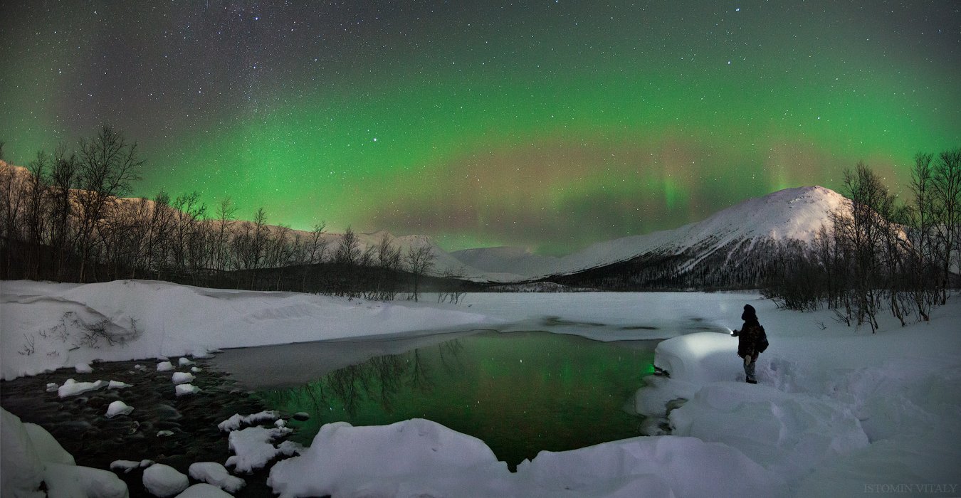 пейзаж,Хибины,ночь,панорама,вода,отражение,звезды,сияние,небо,кольский север,человек,свет,горы,хибины, Виталий Истомин