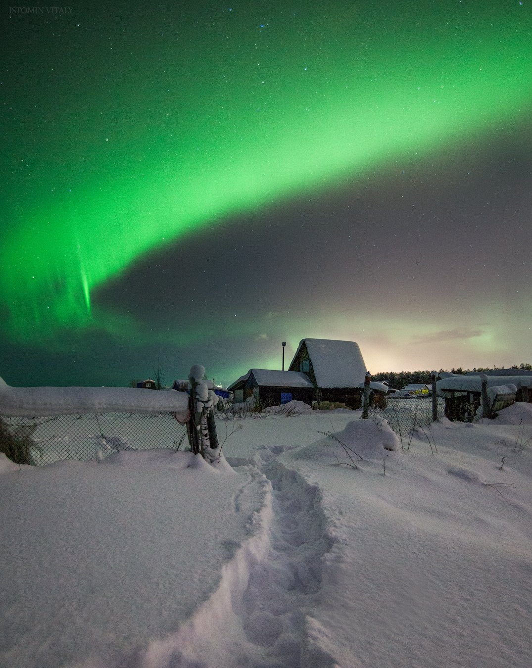 Апатиты,пейзаж,сияние,россия,тропинка,домик,дом,деревня,ночь,звезды,сияние,аврора,снег,зима, Виталий Истомин