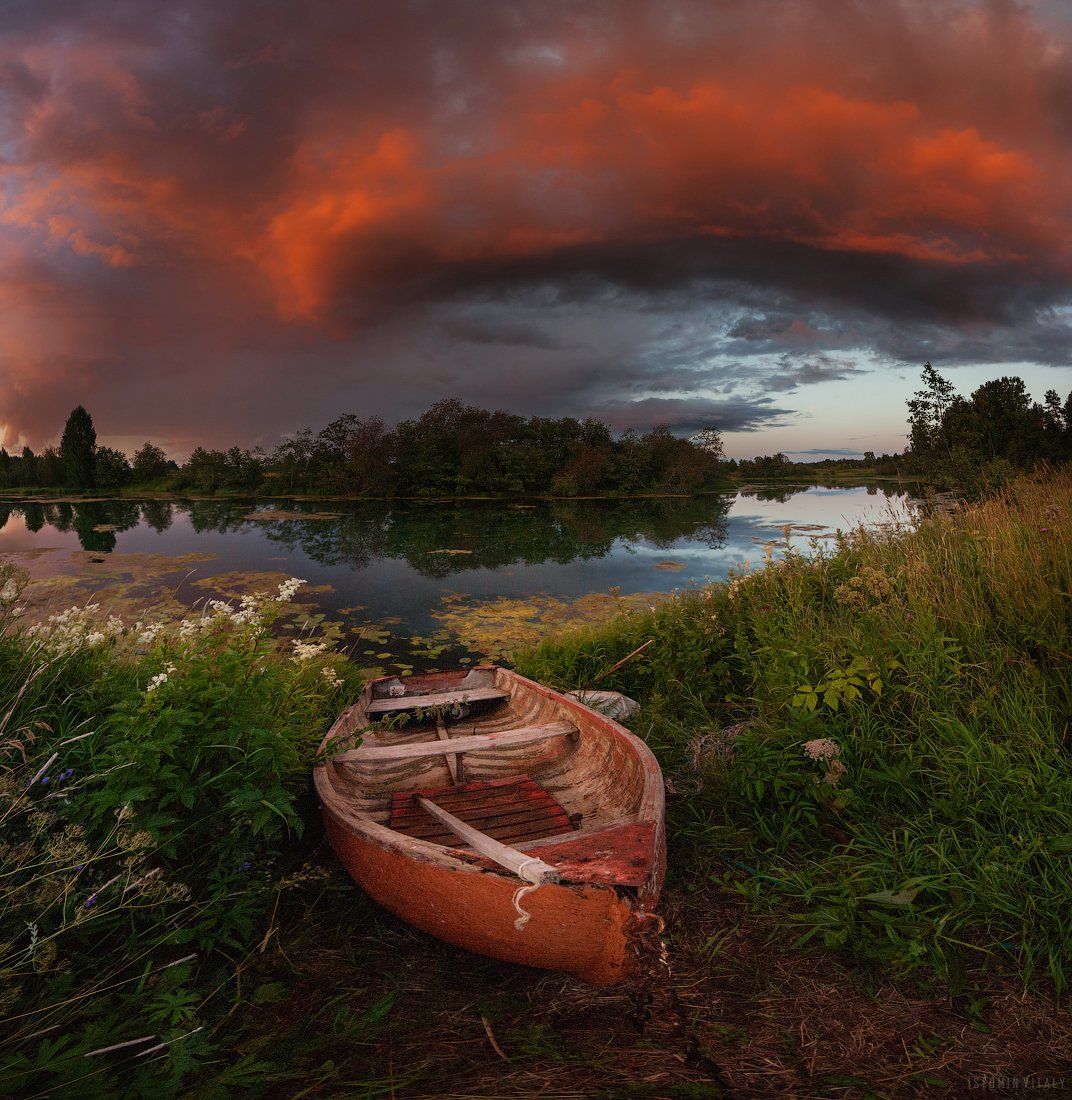 Пейзаж,небо,закат,небо,лодка,трава,вода,озеро,трава, Виталий Истомин