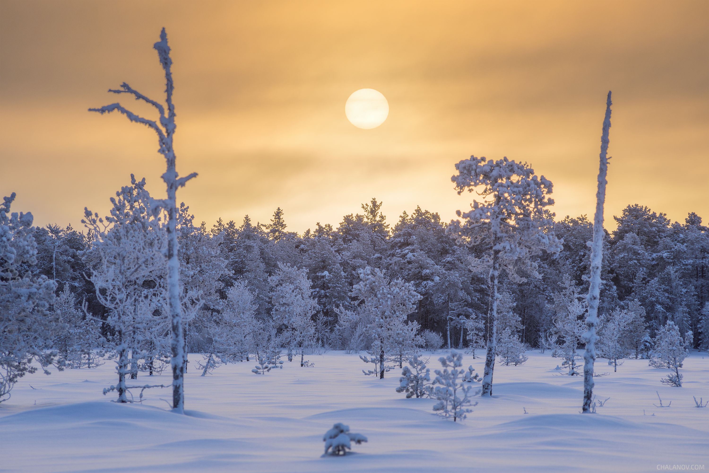 Морозный рассвет на коми болотах, –36 градусов. Весь лес покрылся толстым инеем, деревья превратились в монохромные голубые статуи, морозы не отступают с самого нового года.