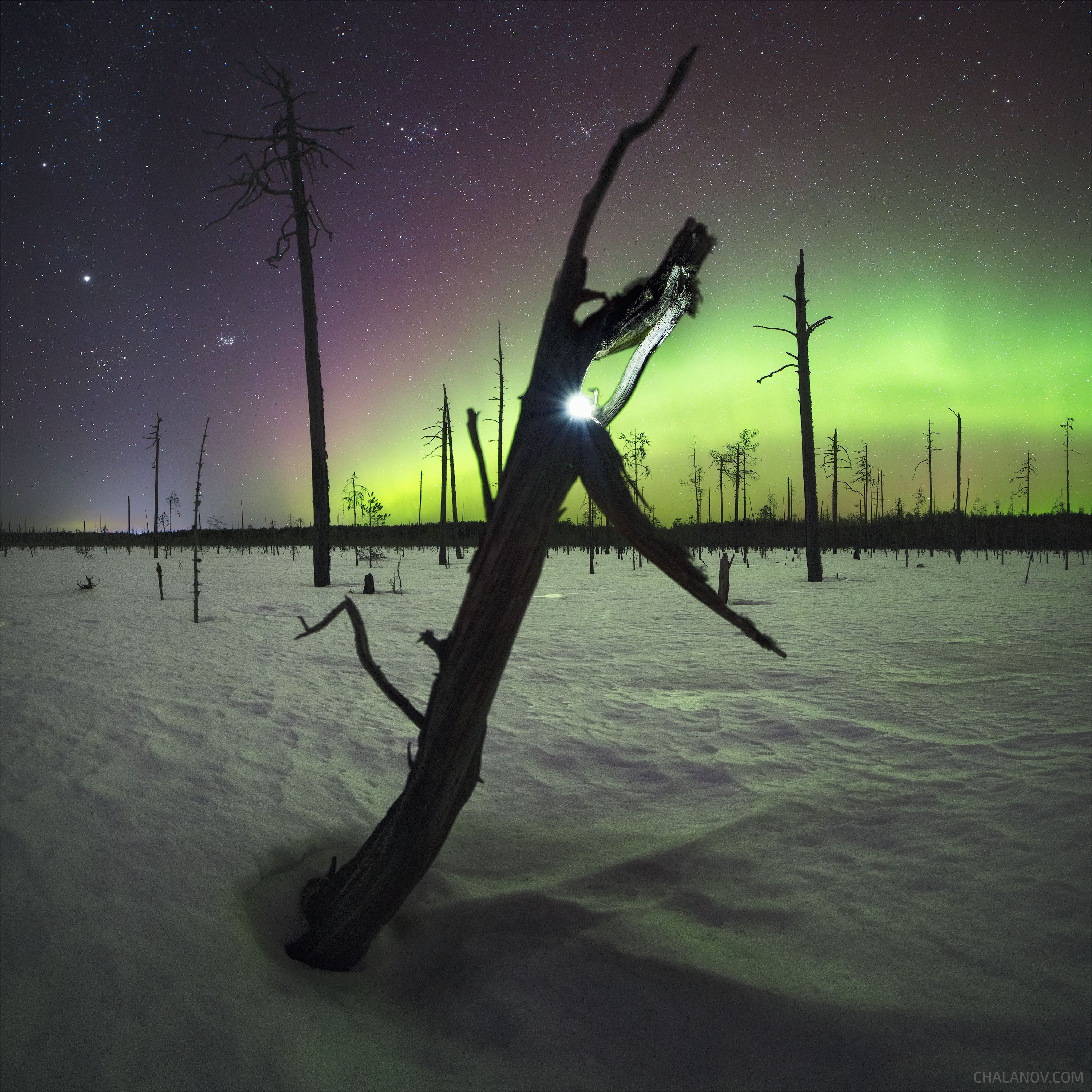 пейзаж, северное сияние, болото, деревья, аврора, ночь, ночной пейзаж, звездное небо, Иван Чаланов