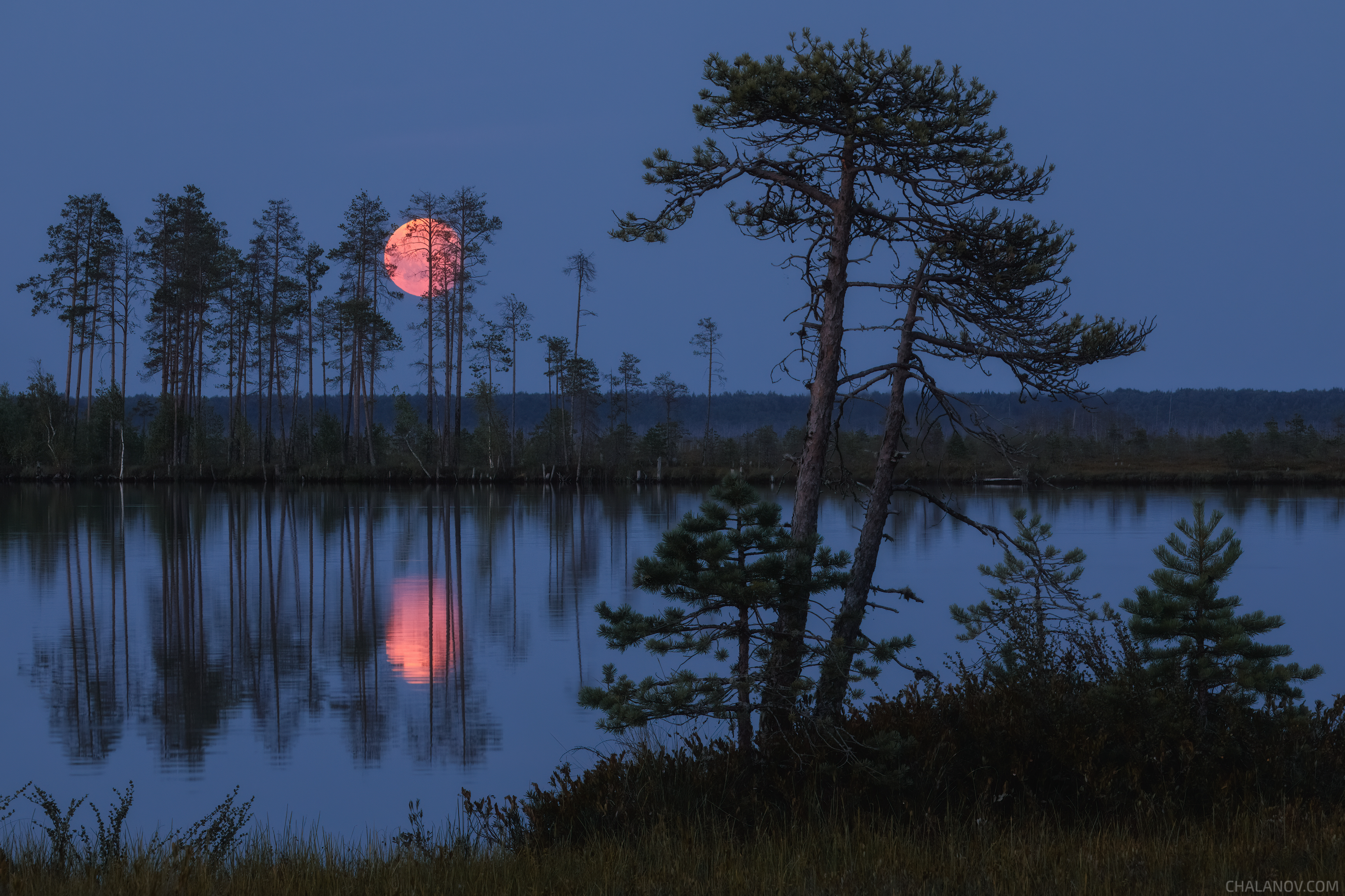 Неплохо. Красная луна над озером Кадам — сильный цветовой акцент, отражение в воде сбалансировано, композиция выдержана. Сосны на переднем плане добавляют глубину, фон — тёмный лес — не перегружает. Ночная сцена передана чётко, без шумов.