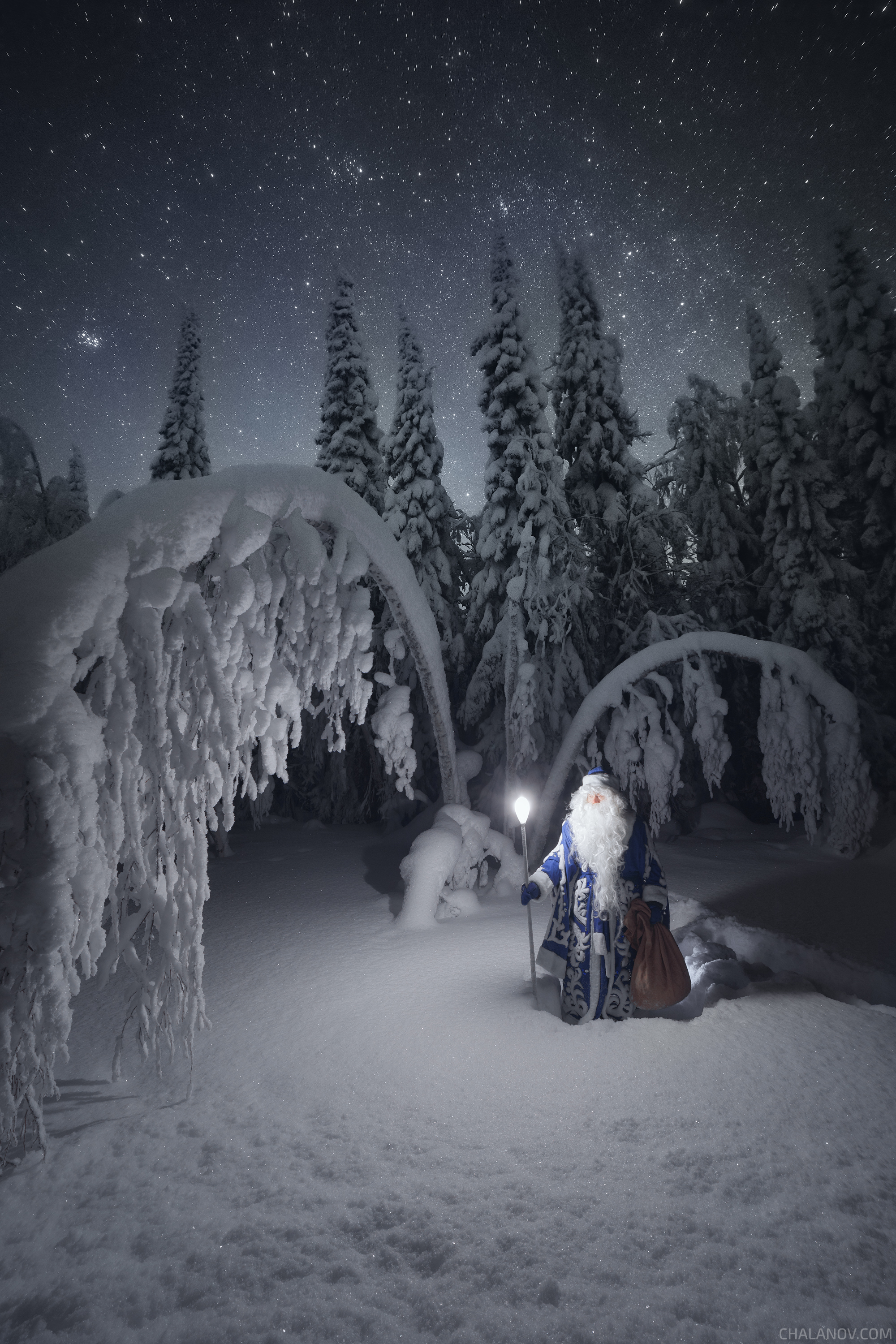 Фотография запечатлела Деда Мороза в снежном лесу Республики Коми под звёздным небом. Сильный мороз и густой снег на ветвях создают атмосферу северной зимы.