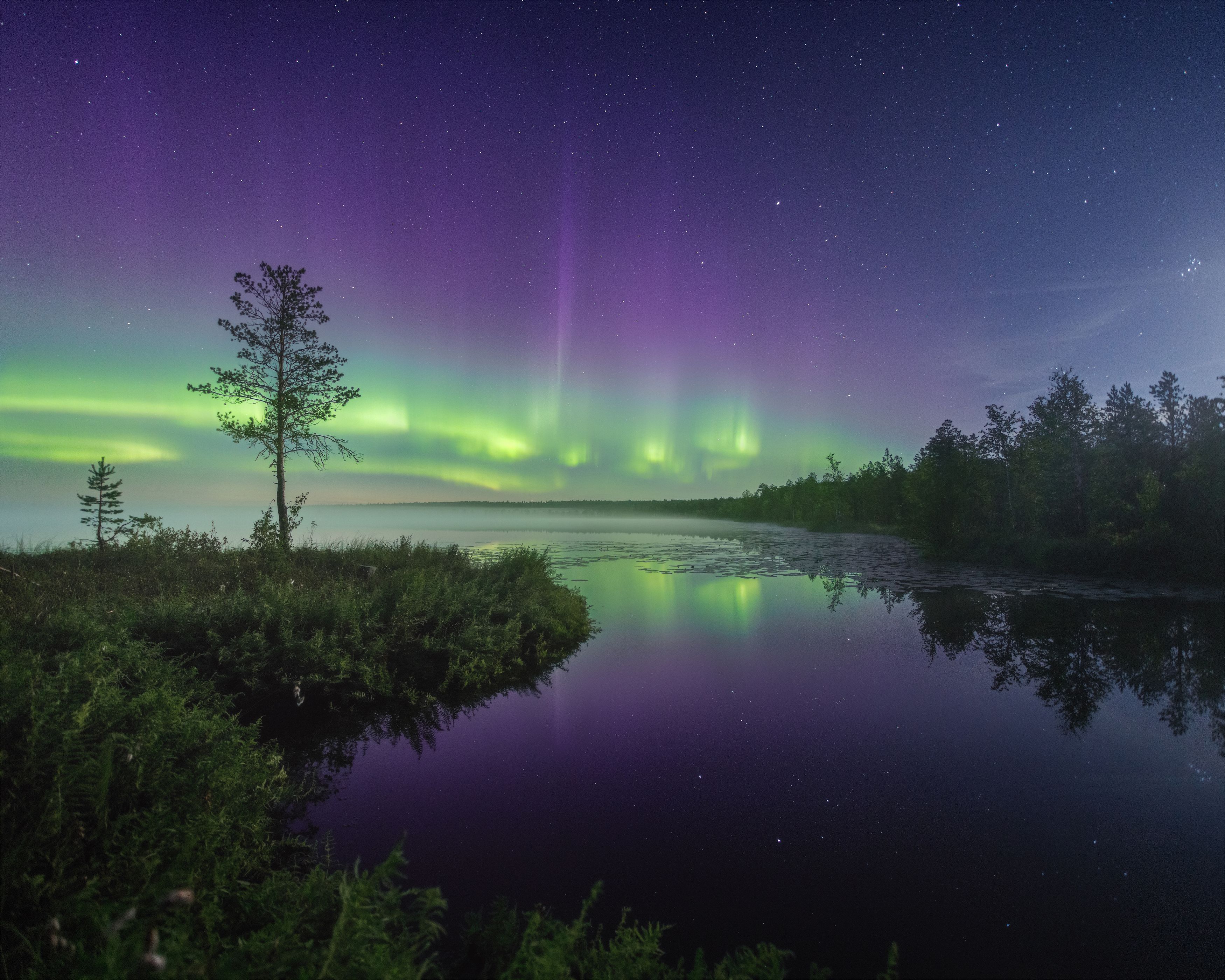 пейзаж, ночь, звезды, осень, северное сияние, полярное сияние, север, туман, landscape, northern lights, aurora borealis, polar lights, nightscape, stars, autumn, fog, Чаланов Иван