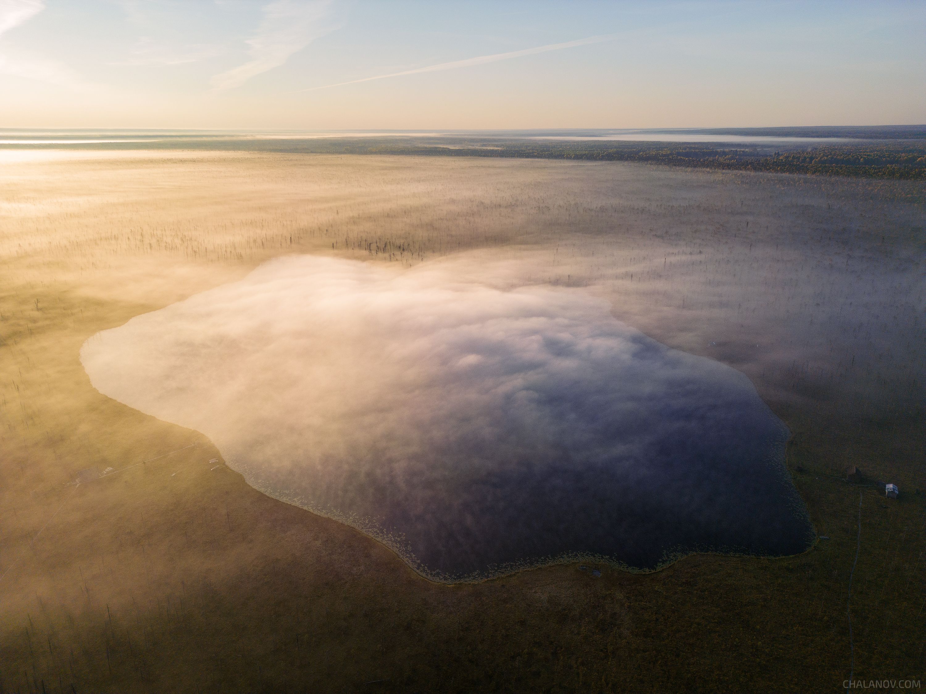 пейзаж, утро, осень, рассвет, озеро, туман, север, коми, дрон, аэросъёмка, Чаланов Иван