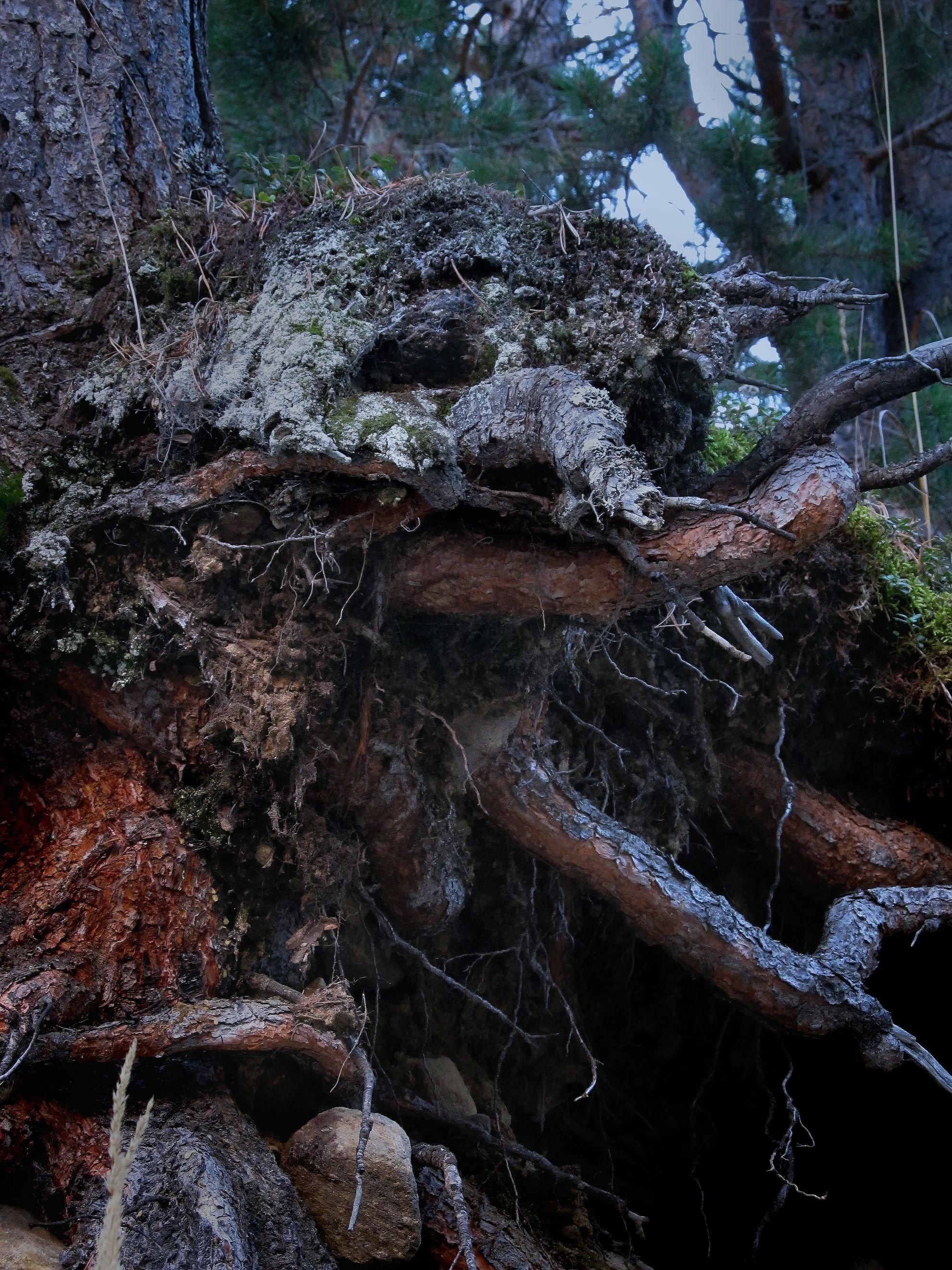 Идёшь так в сумерках по этому лесу, всё так мрачно, настораживающее, загадочно, ощущение что за тобой наблюдают кто то за спиной , затылком чуешь, по спине холодок, ноги сразу ватные и потом прошибает, кругом какие то жуткие, враждебные звуки, что то ухнет, заскрипит, захрустит, спотыкаешься, падаешь, поднимаешь голову и тут такое чудо-юдо, невольно можно обделаться;)))