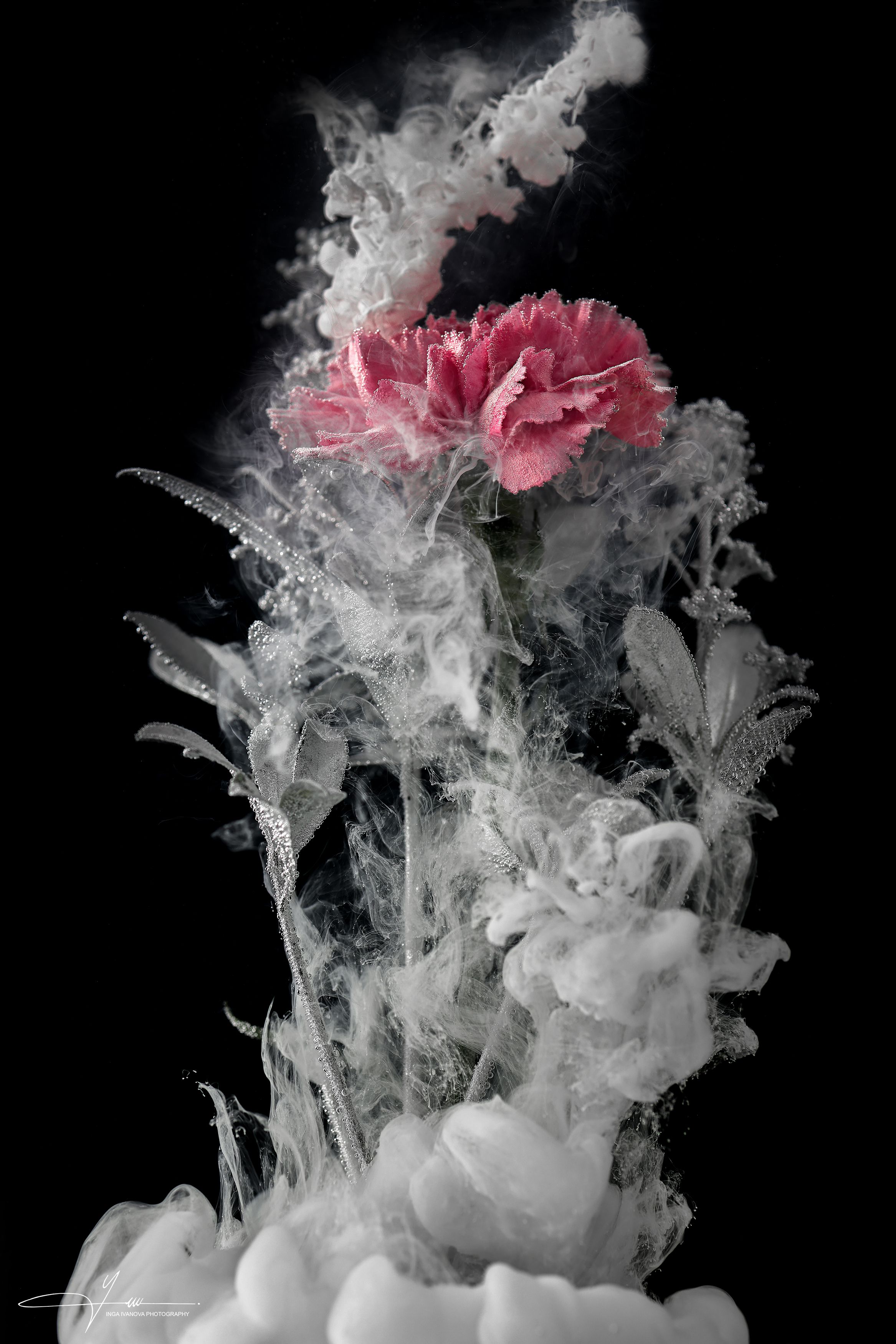 Вы, Inga, снова выстроили кадр, где цветок — не просто объект, а центр тяжести, в котором застыл миг. Розовый бутон как точка в сердце дымки, а вокруг — почти кристаллическая структура, будто вода замерзла в движении. Свет у Вас всегда работает тонко — он не бьёт, а ложится, подчёркивая рельеф, не разрушая хрупкости.