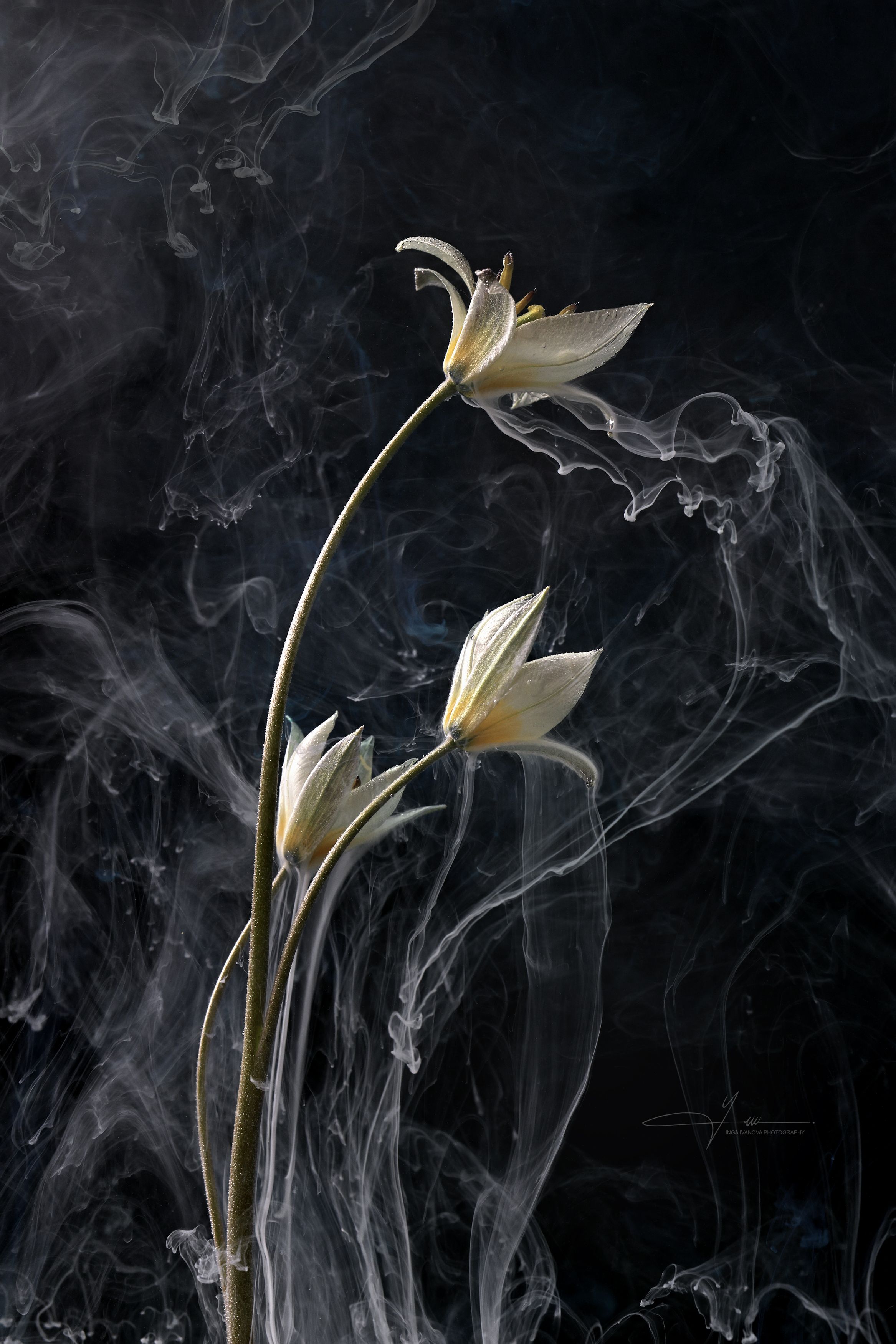 В этой работе фотограф Ирина Иванова создаёт атмосферу таинственности и хрупкости. Белые тюльпанамы парят в облаках дыма на глубоком чёрном фоне, подчёркивая графичность линий и игру света. Снимок демонстрирует мастерство контроля над атмосферой и превращает обычную флористику в возвышенное искусство.