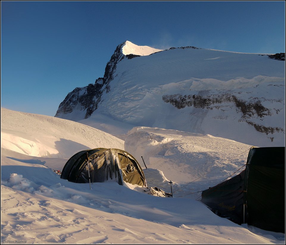 Нее, не так:) Они щас проснутся, кашу проглотят и наверх вот сюда crop(410,324,487,351) на 6460м. Это с другой стороны вершины - на классическом маршруте народ отлеживается, а нам неделя от травы до травы на 3600м, после Коммунизма ещё на Ленина надо взойти по сложному маршруту и тоже а альпийском стиле.