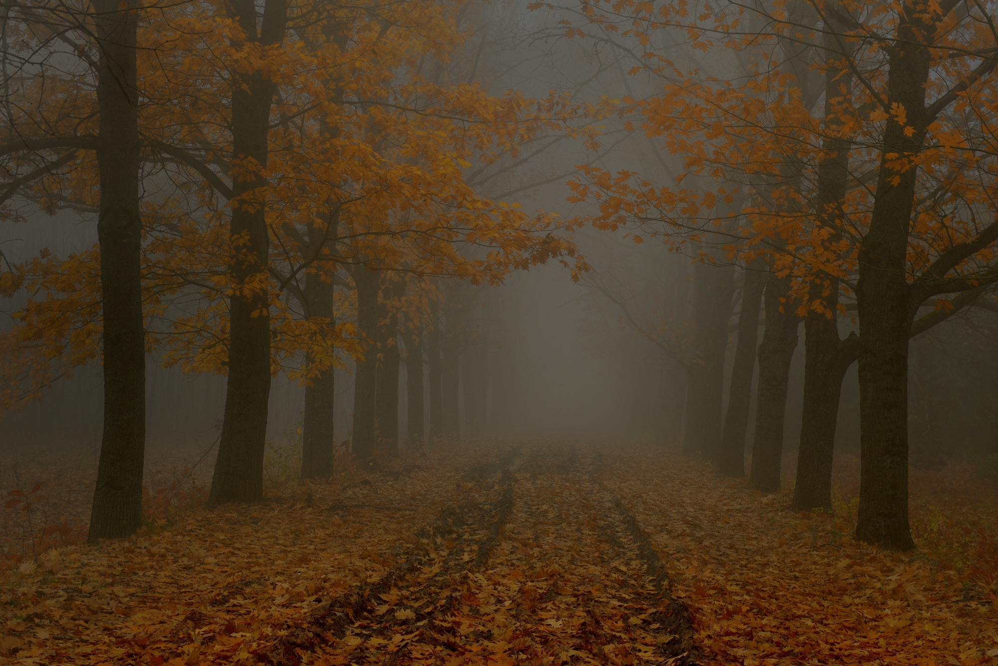 осень листва утро туман дорога, Александр Жарников