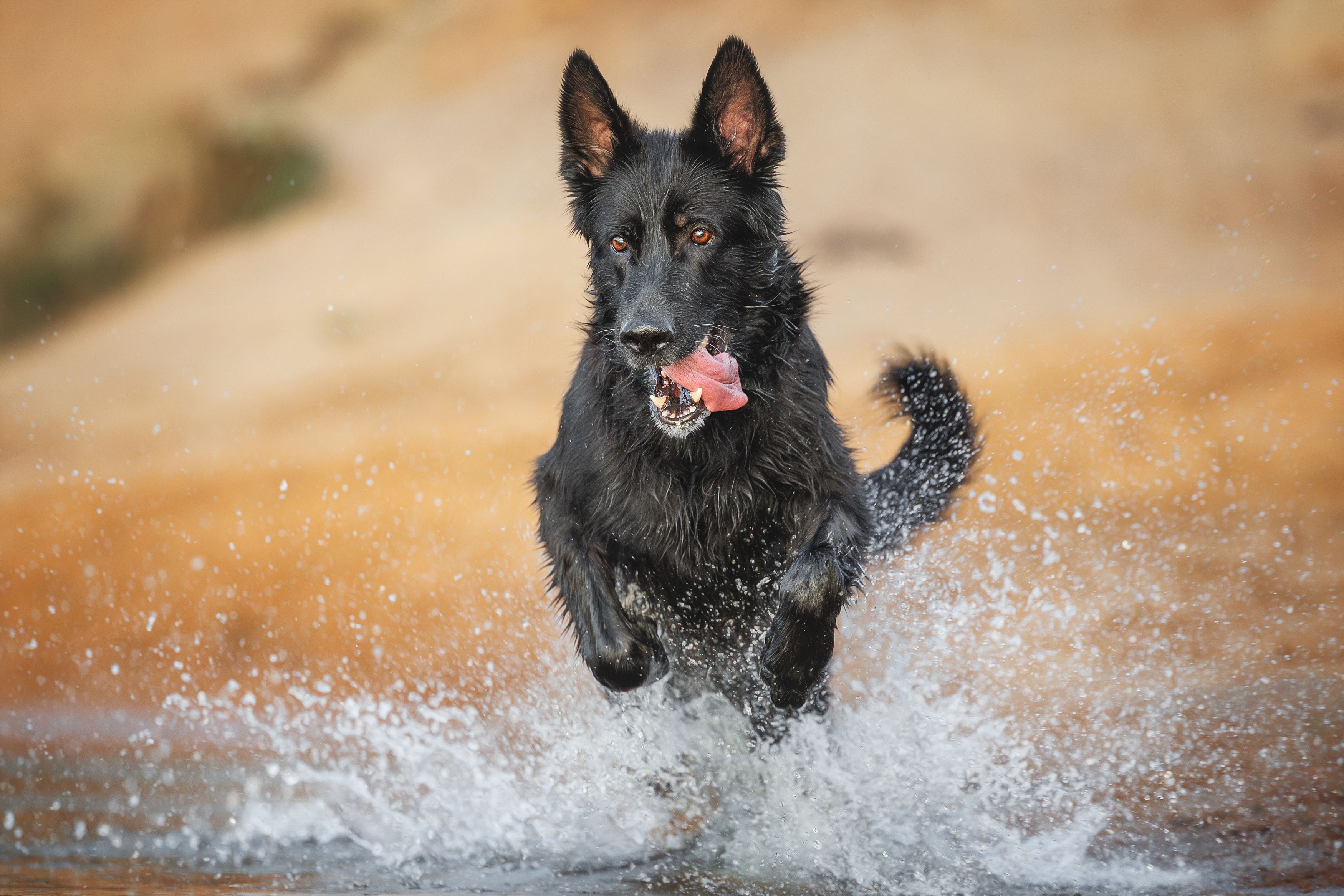 На снимке запечатлена чёрная собака, бегущая по мелководью с поднятыми ушами и слегка приоткрытым ртом. Вода вокруг неё брызгает, создавая ощущение скорости и энергии. Фон — размытый песчаный берег, что подчёркивает движение. Снимок передаёт живость момента и естественную грацию животного. Фотография выполнена с высокой точностью и динамичным ракурсом. Фотограф: Яна Нарбутович.