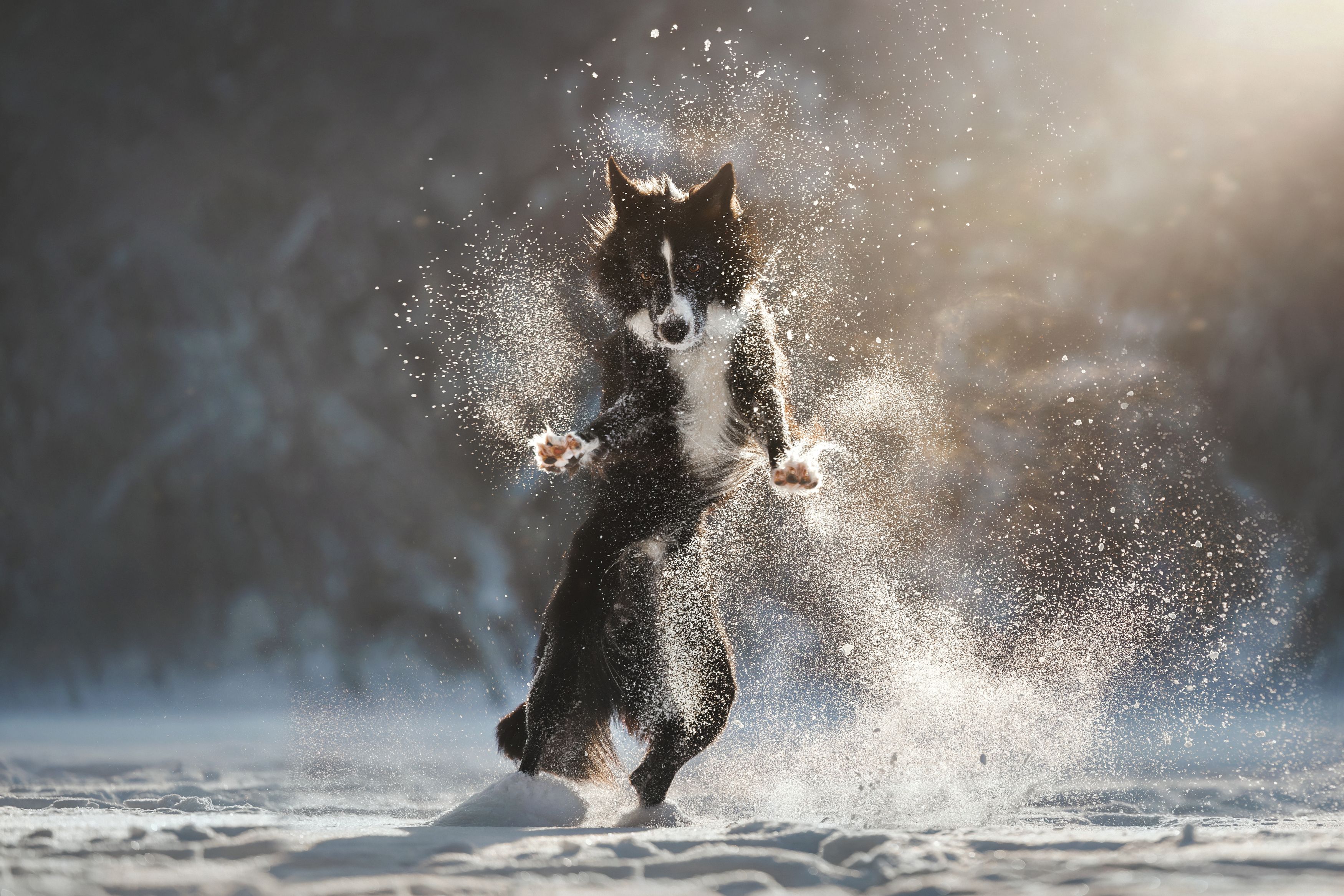 Этот момент — как будто время замерло в прыжке. Собака не просто бежит, она танцует со снегом.