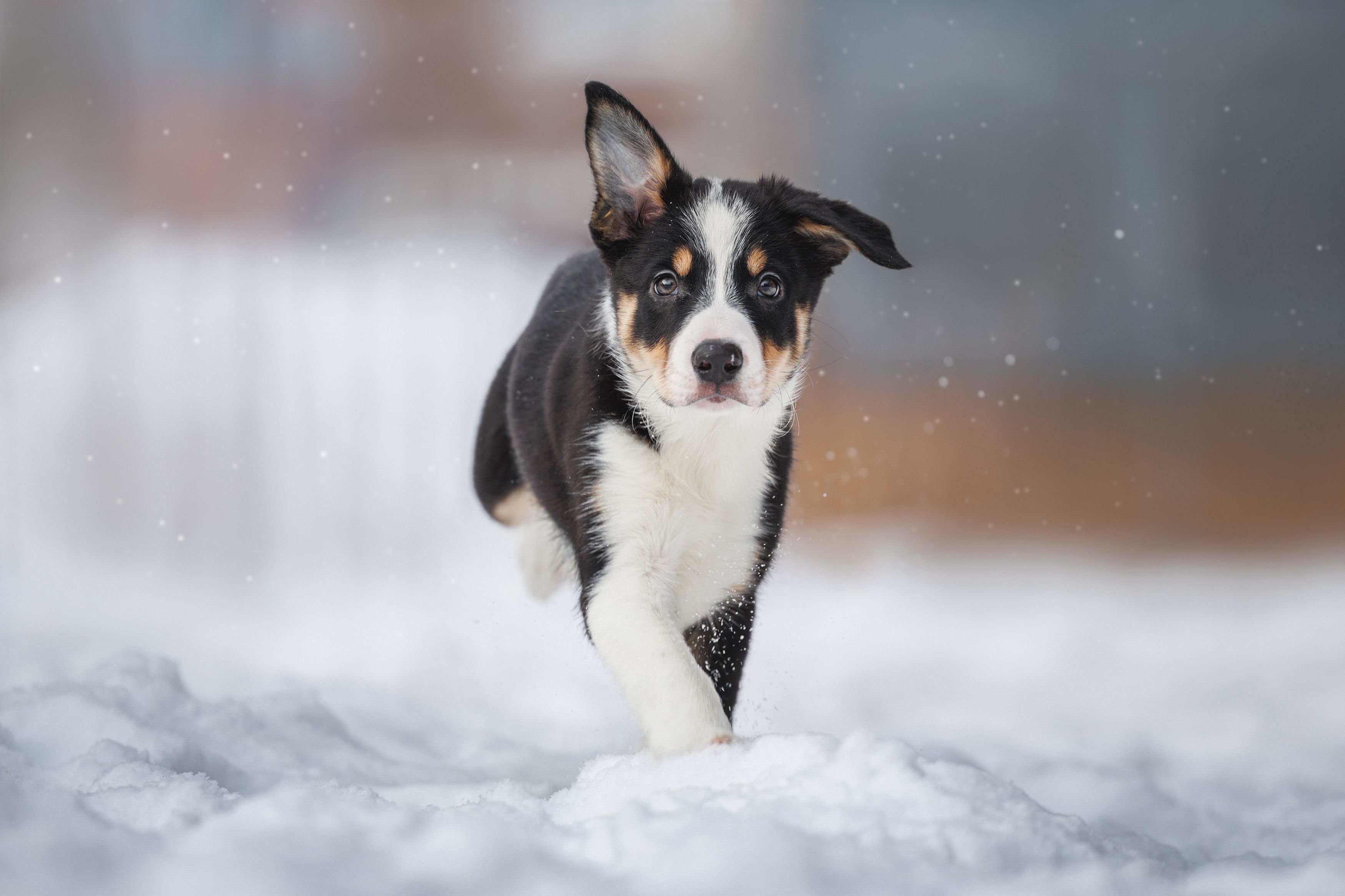 Щенок в снегу — живая радость, глаза прям в душу смотрят.