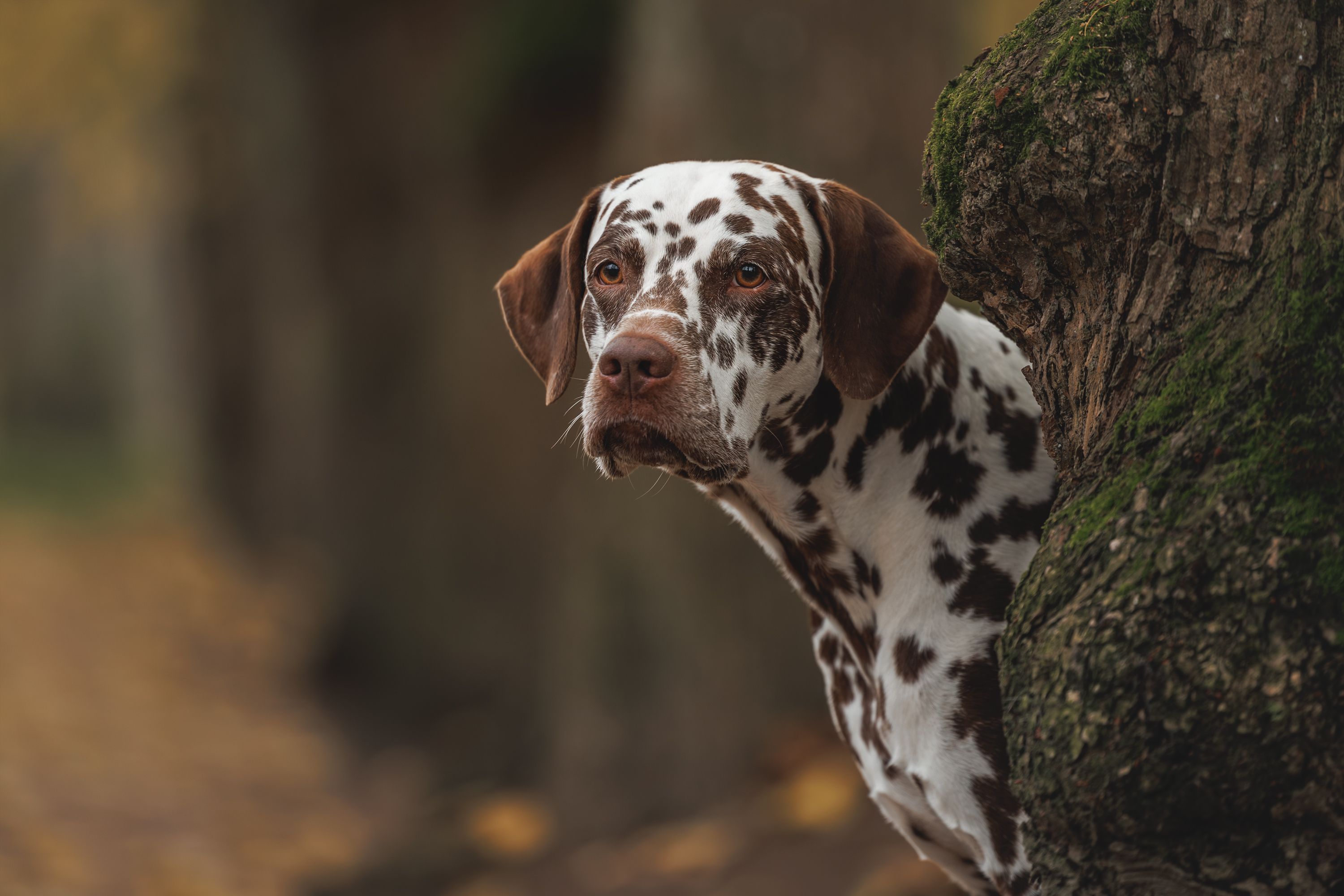 На фотографии запечатлен момент, когда датский дог осторожно выглядывает из-за ствола покрытого мхом дерева. Его внимательный взгляд направлен в сторону, словно он следит за чем-то интересным или просто наслаждается атмосферой осеннего парка. Сцена передает спокойствие и естественное поведение собаки на свежем воздухе. Фотограф Яна Нарбутович успешно передала характер животного и атмосферу момента.