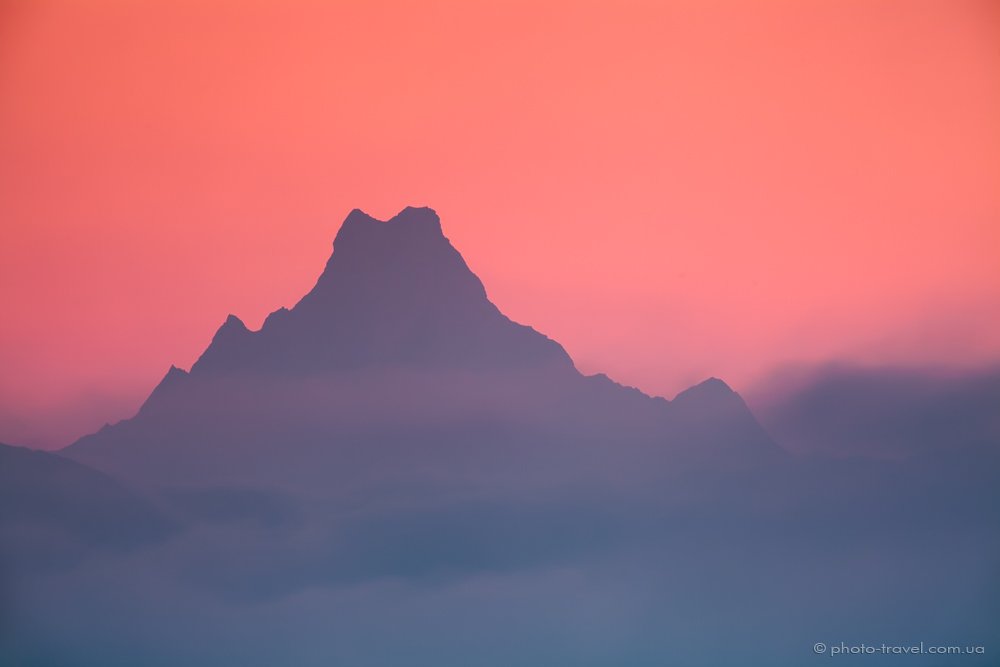 Всемирно известная Гималайская вершина Machhaphuchhare (6997 м) - священная, неприступная обитель бога Шивы, одна из немногих вершин в мире, которая так и осталась непокоренной человеком. Решением непальского правительства с 1957 года данная гора закрыта для восхождений. Эта сказочно красивая вершина должна оставаться на вечные времена непокоренной. Её двойная вершина (которую особенно хорошо видно именно с этого ракурса) напоминает хвостовой рыбий плавник, поэтому и название: Мачапучаре в переводе с непальского означает «Рыбий хвост». Со стороны же Покхары, которая находится всего в 25 километрах от горы, данная вершина больше похожа на альпийский Маттерхорнwww.photosight.ru/photos/3632561/ .