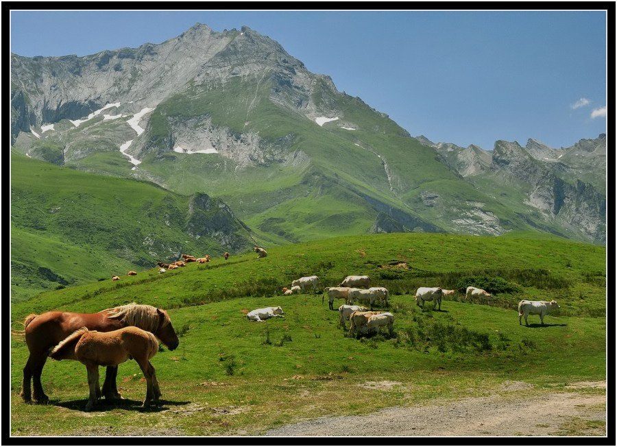 The light is too harsh here for quality photography in my view... the shadows are very deep, the whites are blown out (even despite your attempts to save them in post processing they still do not look natural). As result the picture looks pretty flat overall. Compositionally the horses are too much jammed into the corner - I would allow at least 2 cm of breathing space to the left of them. On the positive side I like the setting, it is a beautiful place and the animals have done a great job posing :-) I hope this feedback will be useful to you.