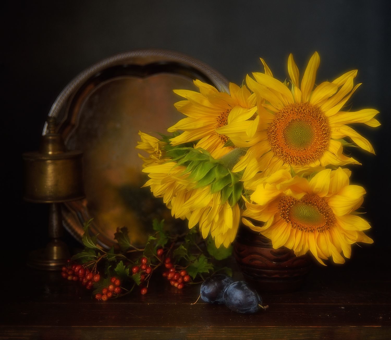 натюрморт,подсолнухи,калина,сливы,ягоды,цветы,лето, Наталия К