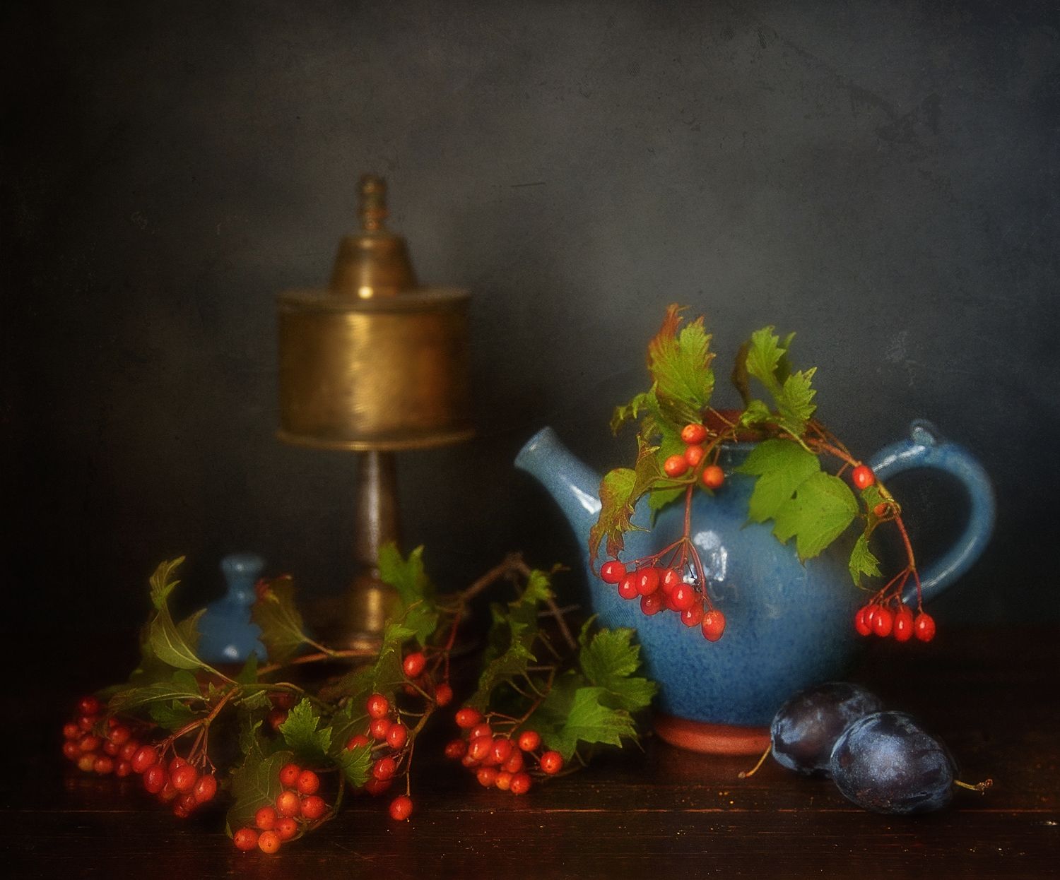 натюрморт,чайник,лампа,калина,сливы, Наталия К