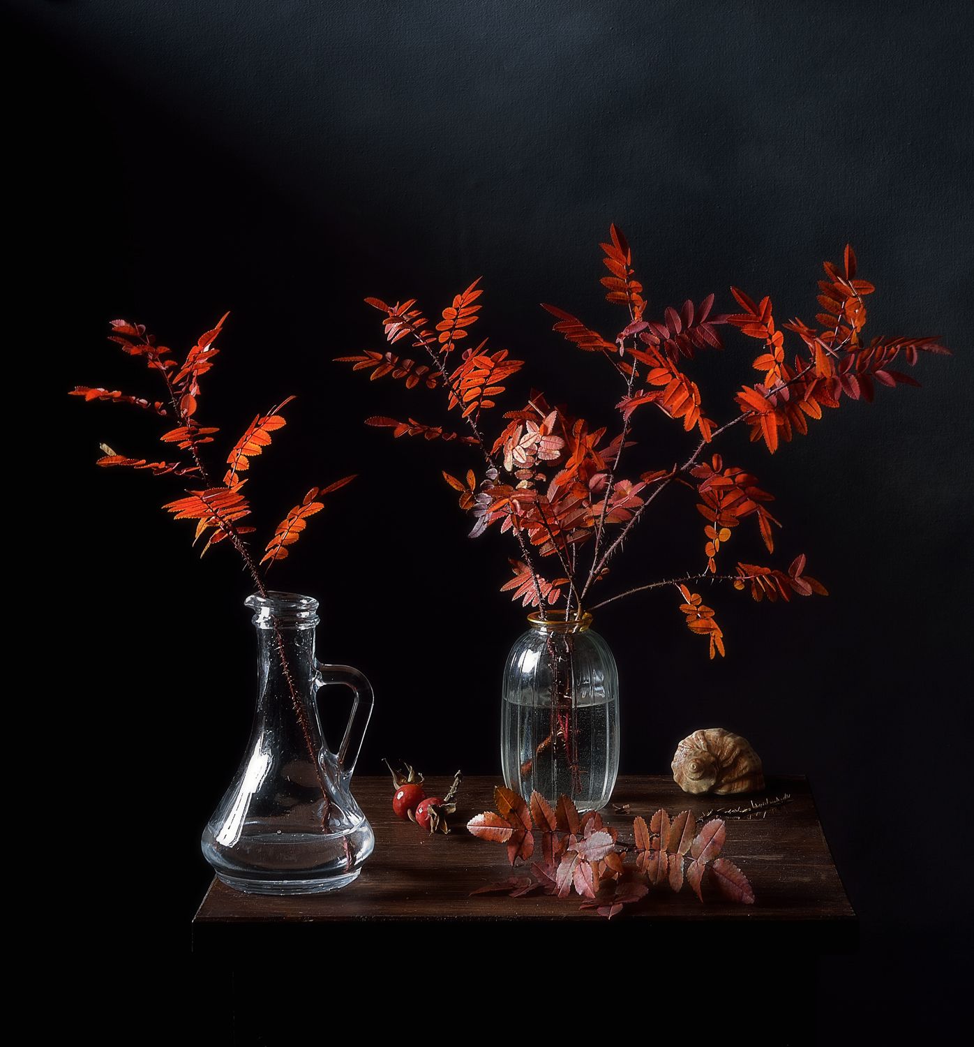 натюрморт,осень,листья,стекло,ракушка,шиповник, Наталия К