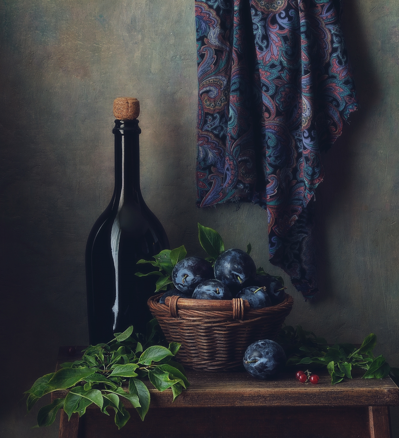 натюрморт,сливы,бутылка,корзина,лето, Наталия К